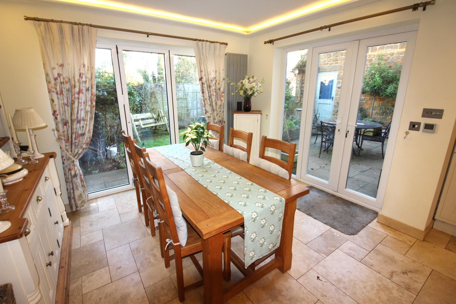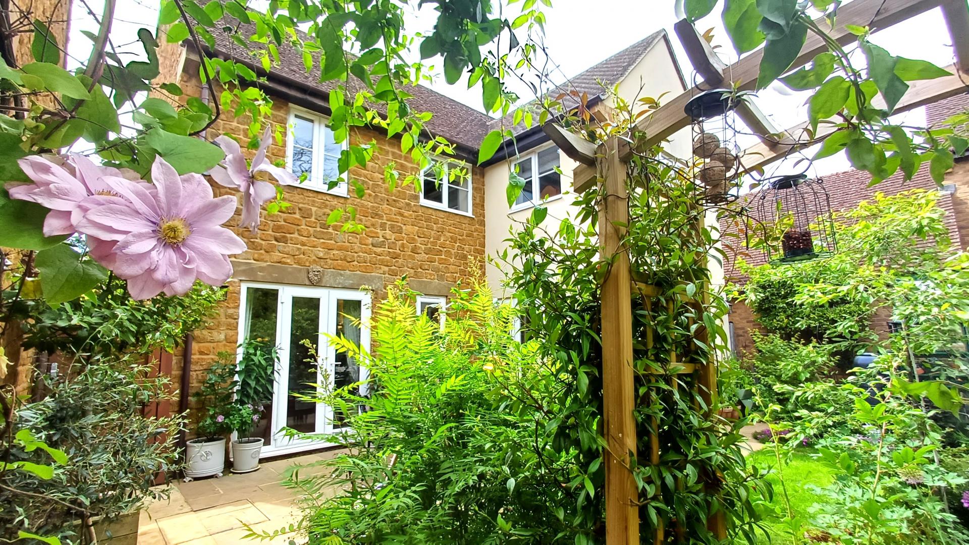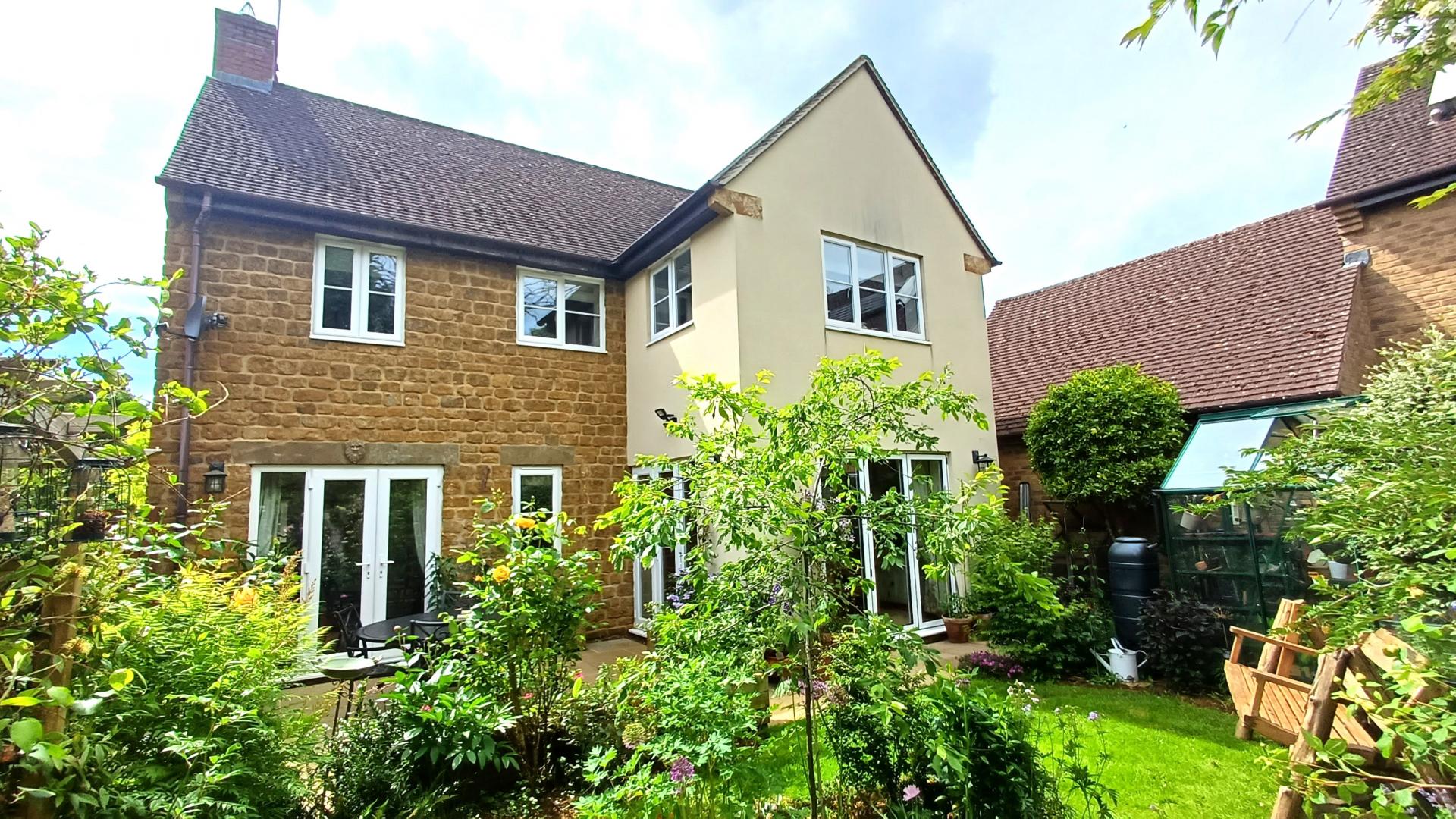 AN EXTENDED FOUR BEDROOM DETACHED HOUSE IN LOCAL IRONSTONE WITH DOUBLE GARAGE & LOVELY COTTAGE STYLE GARDENS QUIETLY SITUATED IN THIS EXCEPTIONALLY POPULAR VILLAGE WITH EXTENSIVE FACILITIES. THE ACCOMMODATION IS ARRANGED AS FOLLOWS: GROUND FLOOR: ENTRANCE HALL, STUDY, LIVING ROOM WITH WOOD BURNING STOVE & FRENCH DOORS TO GARDEN, FAMILY DINING KITCHEN (25'8" X 14'4") WITH BI-FOLD DOORS TO GARDEN, UTILTY ROOM + WC WITH ACCESS TO GARDEN. FIRST FLOOR: PRINCIPAL BEDROOM SUITE WITH VAULTED CEILING + DRESSING ROOM & EN-SUITE SHOWER ROOM, THREE FURTHETR BEDROOMS, FAMILY BATHROOM. OTHER DETAILS: OIL FIRED CENTRAL HEATING, DOUBLE GLAZING. OUTSIDE: FRONT: DECORATIVE GARDEN WITH BIRCH TREE. REAR: DOUBLE WIDTH DRIVEWAY, DOUBLE GARAGE WITH POWER, LIGHTING & MEZZANINE STORAGE, PRIVATE ENCLOSED GARDEN EXTENSIVELY PLANTED WITH CREATIVITY & IMAGINATION (SEE SUMMER PHOTOGRAPHS), DOOR TO GARAGE, GATED SIDE ACCESS.