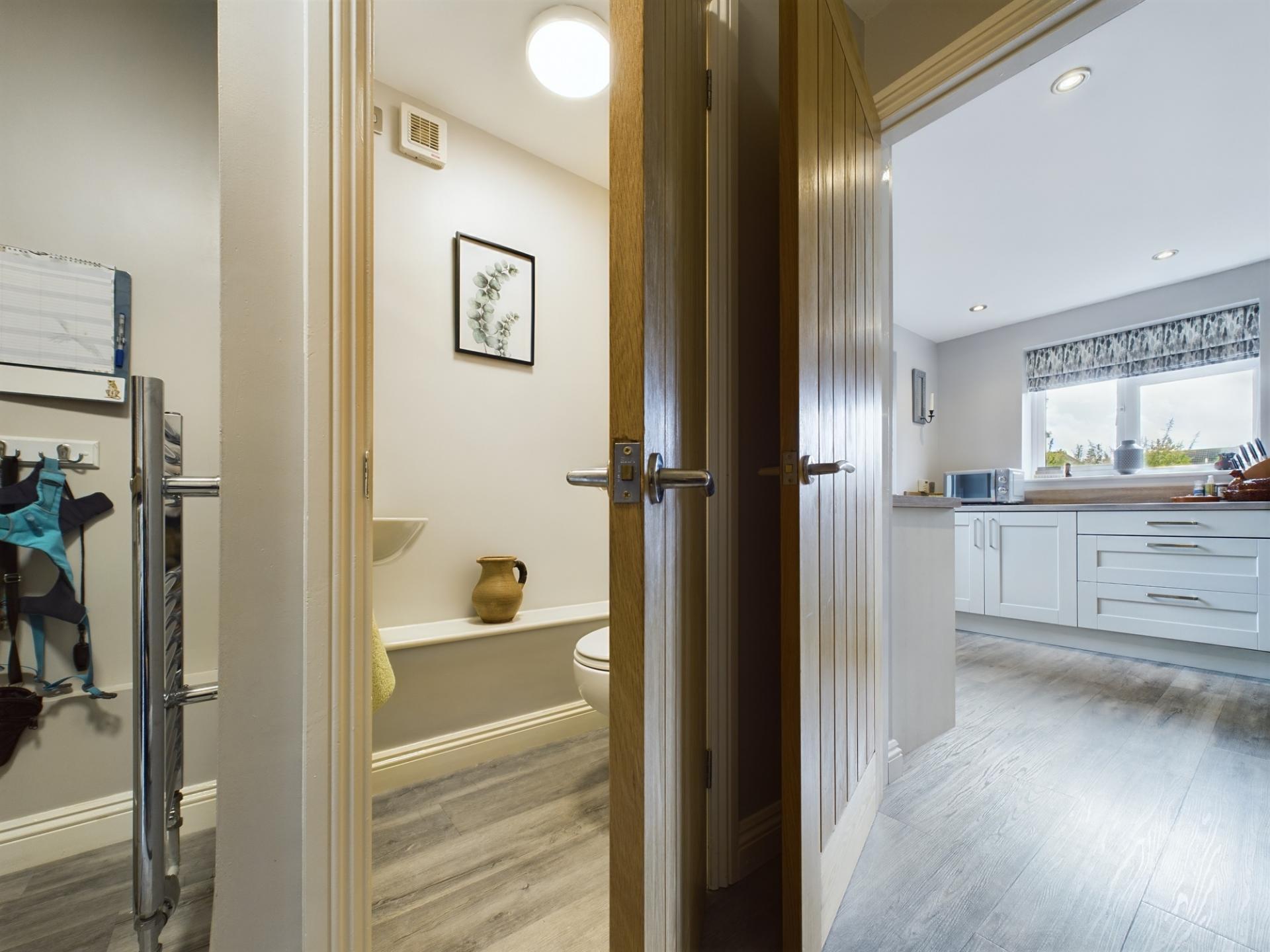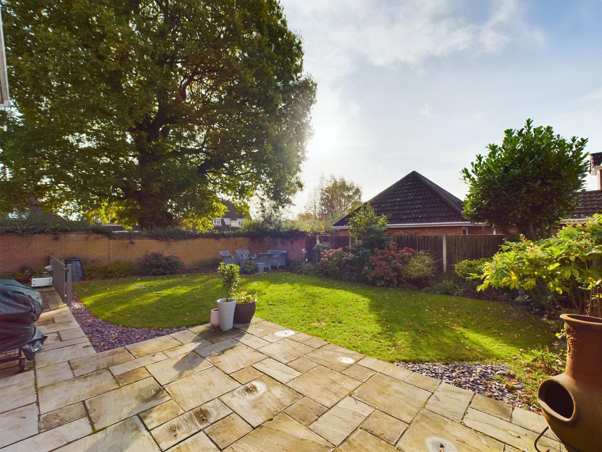 The property is approached over a tarmacadam driveway leading to the main entrance, garage and a gated side access. The garden to the front is laid to lawn with a border of mature shrubs. The garage has an up and over door, light and power. The private rear garden is mainly laid to lawn with two paved seating areas and well established borders of perennial plants and shrubs. A gated fence separates two areas of the garden ideally suited for pets and children.