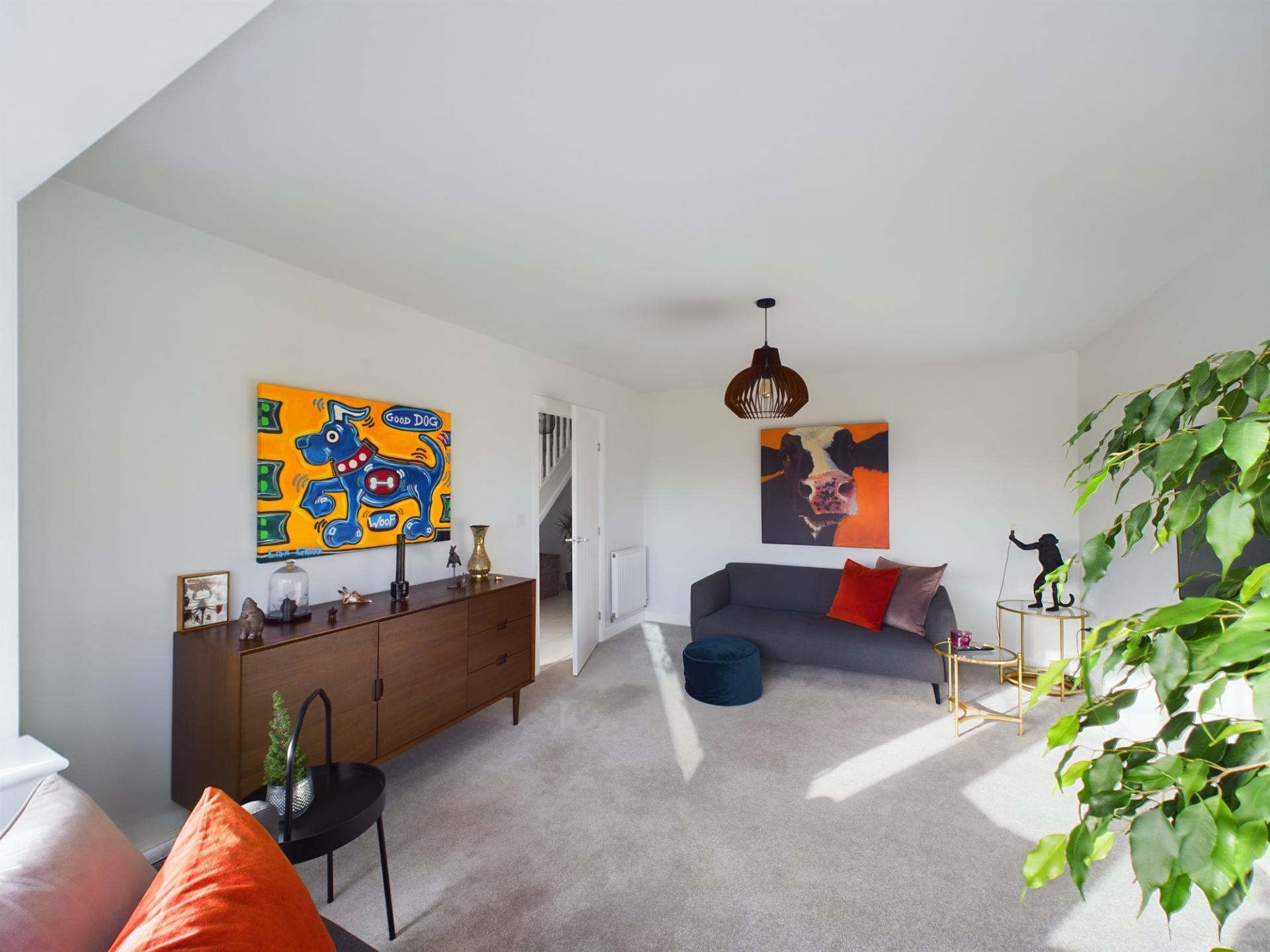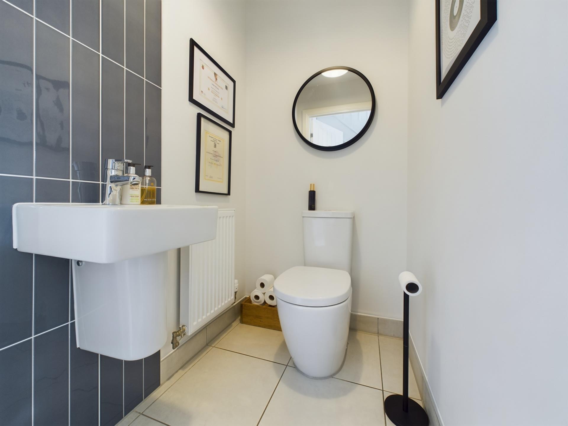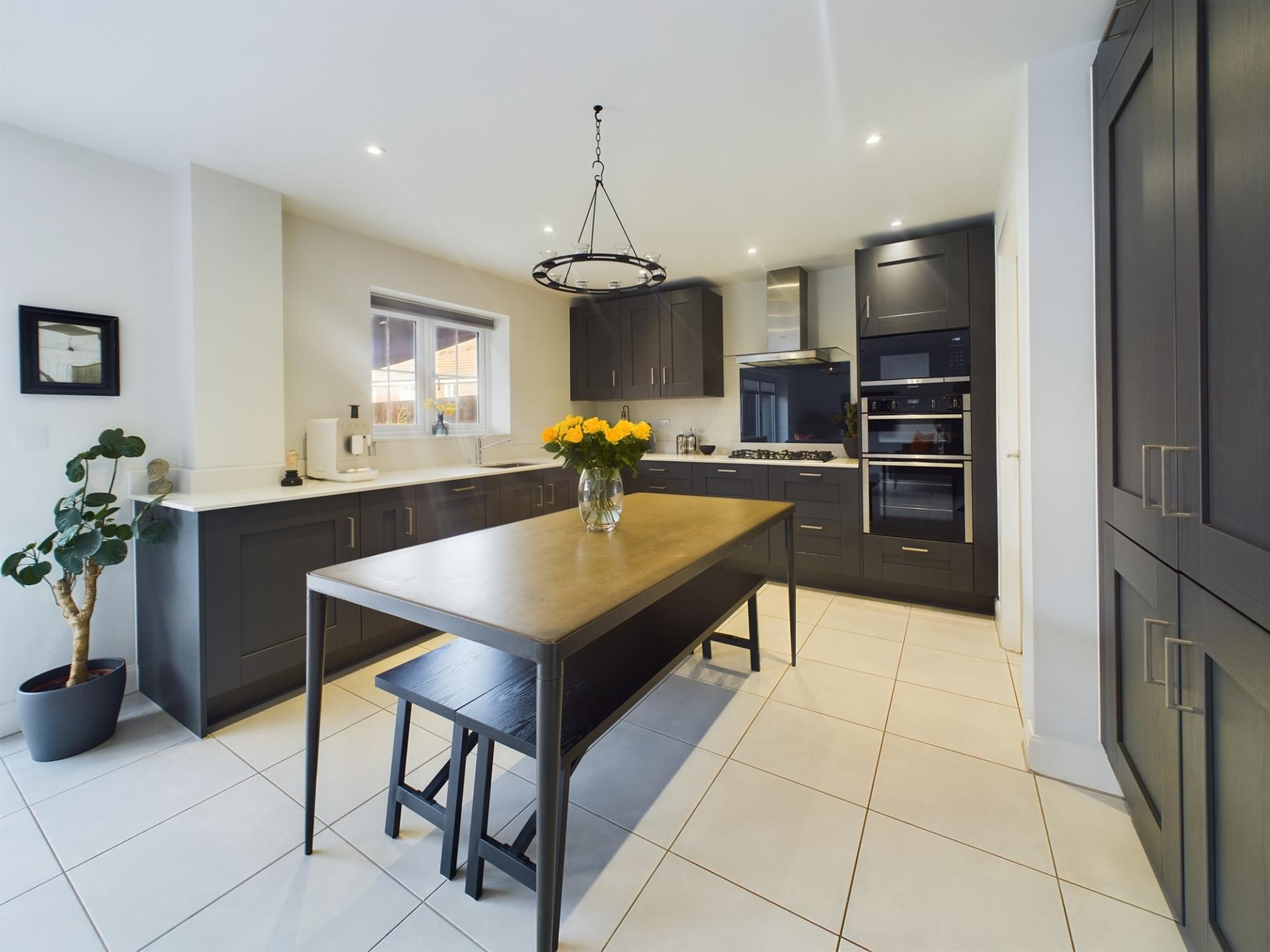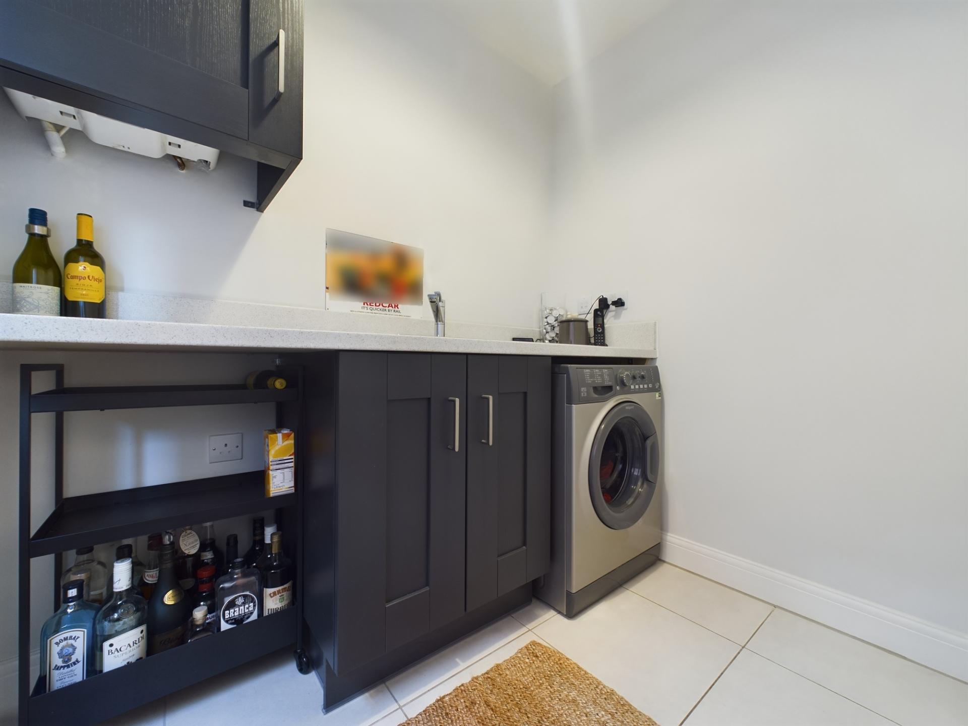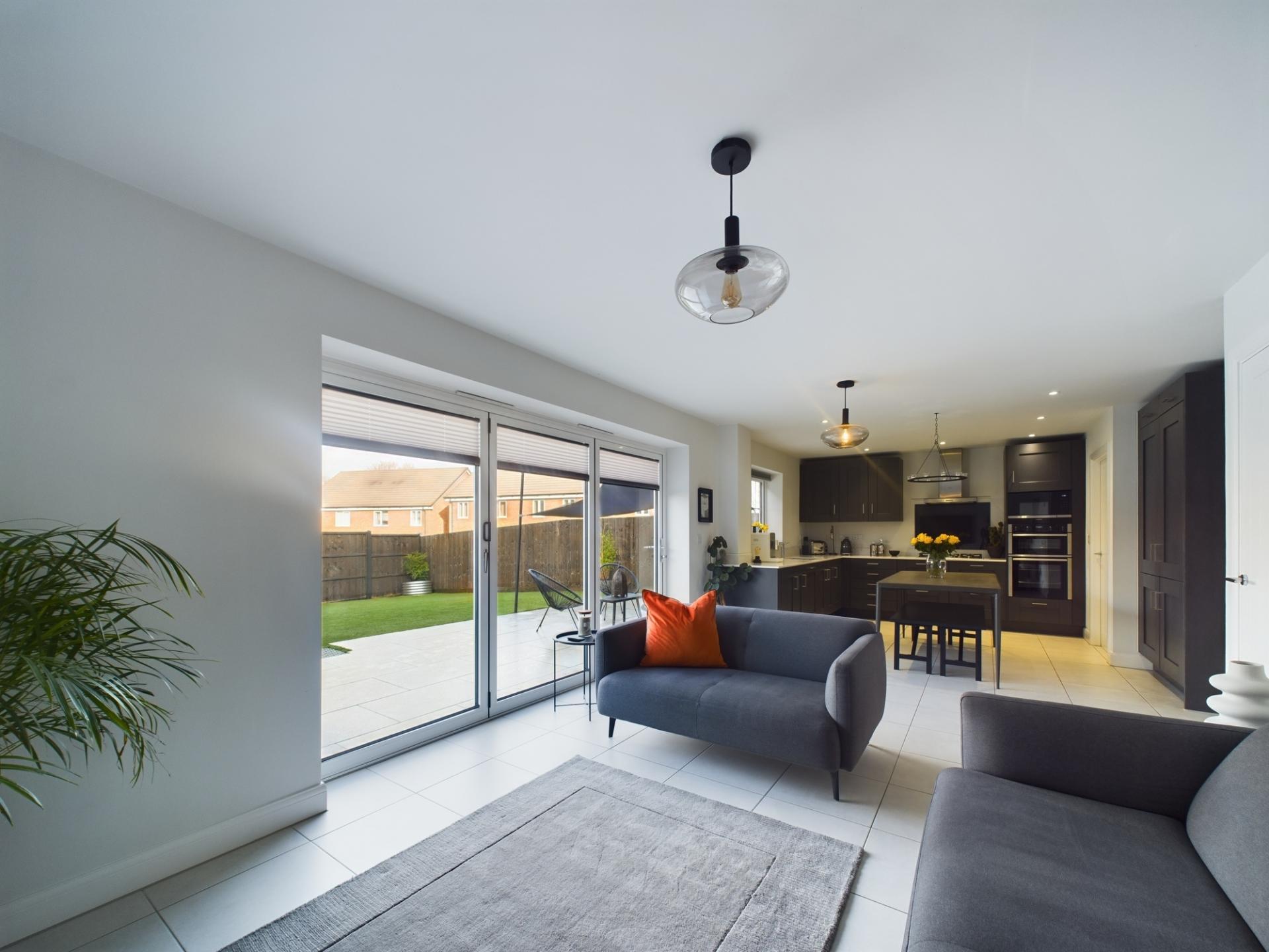 The entrance hall has ceramic tiling to the floor and access to the kitchen/dining/family room, sitting room and guest cloakroom. The sitting room has a bay window to the front having a countryside outlook. The kitchen/dining/family room has ceramic tiling to the floor and bi-fold doors to one wall opening onto the rear garden. The kitchen has a range of wall and base units with quartz worksurfaces and 1.5 inset sink. Integrated appliances include a Neff 5 Ring gas hob with extractor over, two Neff ovens, integrated microwave, dishwasher, fridge and freezer. The laundry houses the boiler, with standing space and plumbing for a washing machine and dryer, base units and stainless steel sink. A door provides side access to the rear garden.