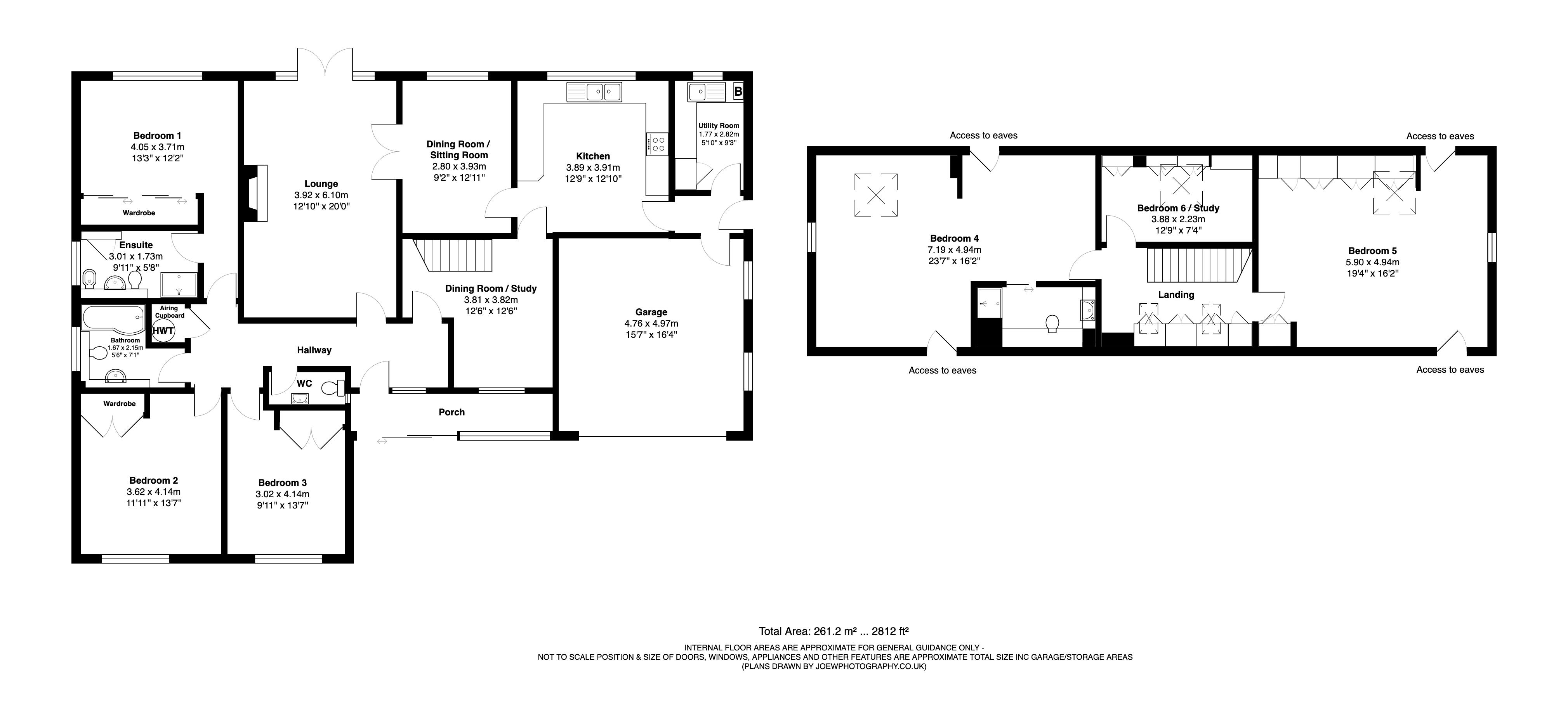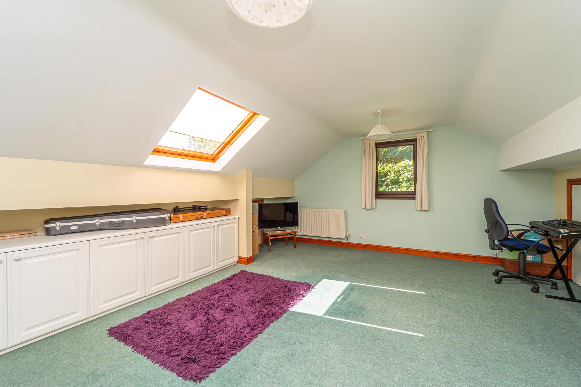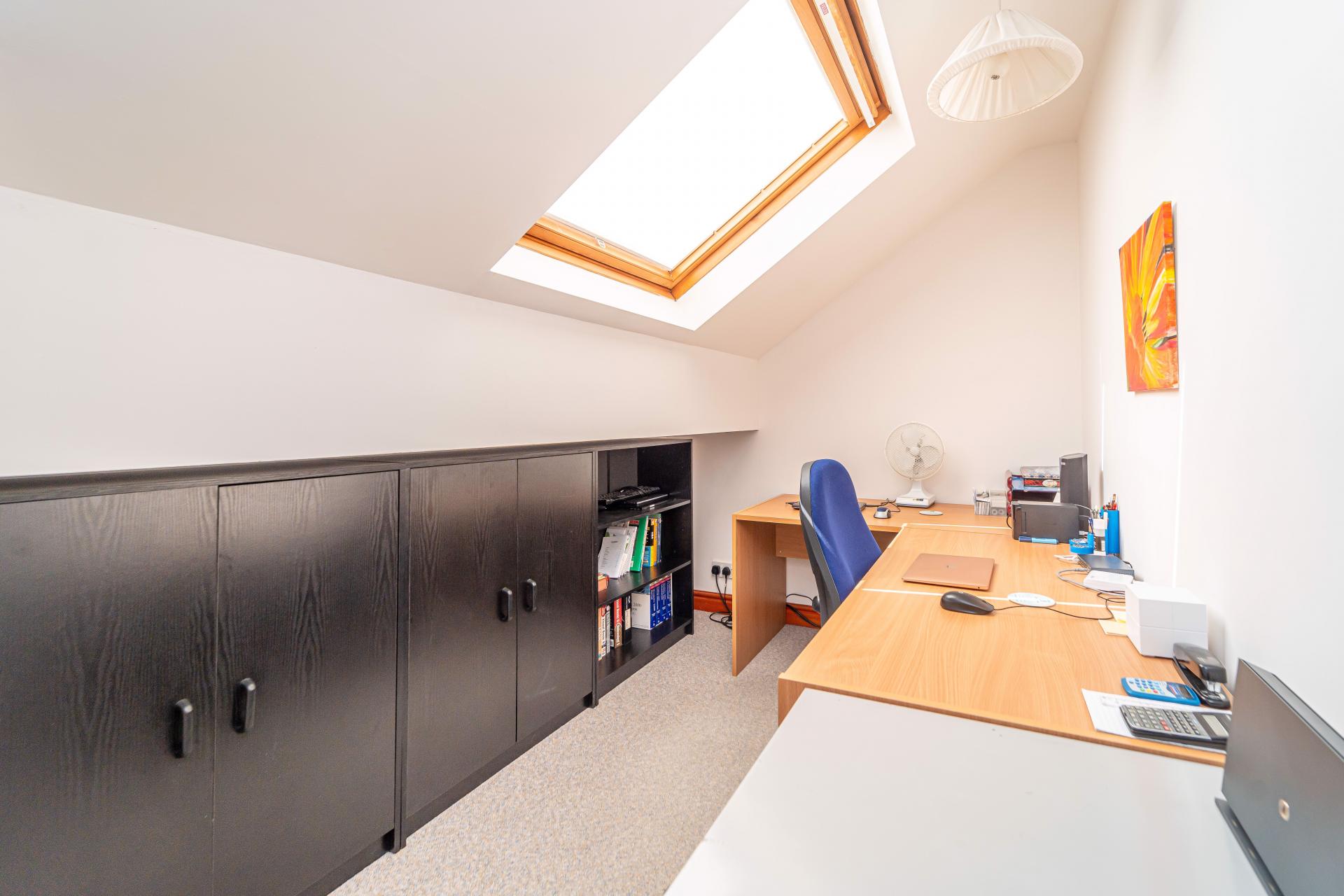 Stairs lead from the reception room 3 to first floor landing. The landing has a range of built in storage cupboards. Bedroom 4 is a large double bedroom with access to under eaves/roof space storage. The en-suite has a shower cubicle with electric shower, wash hand basin and W. C set into a vanity unit. Bedroom 5 is a large double bedroom with access to under eaves storage. Bedroom 6 is currently used as an office.
