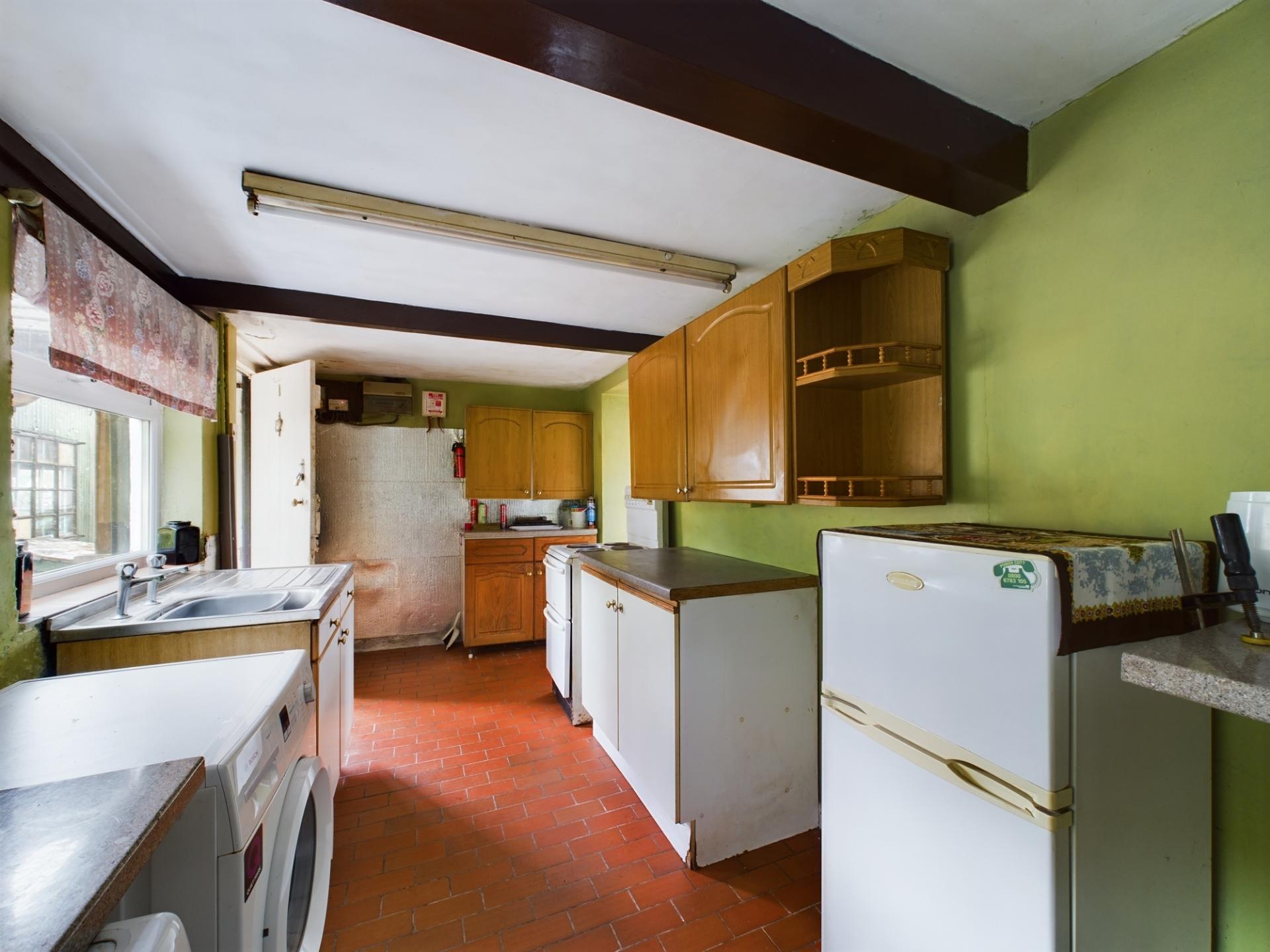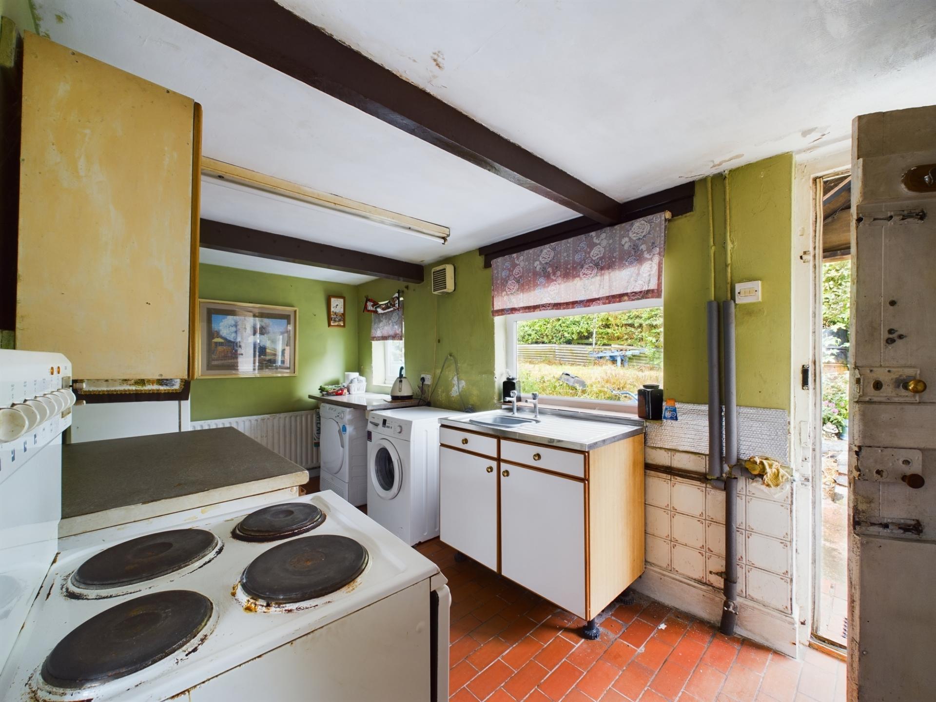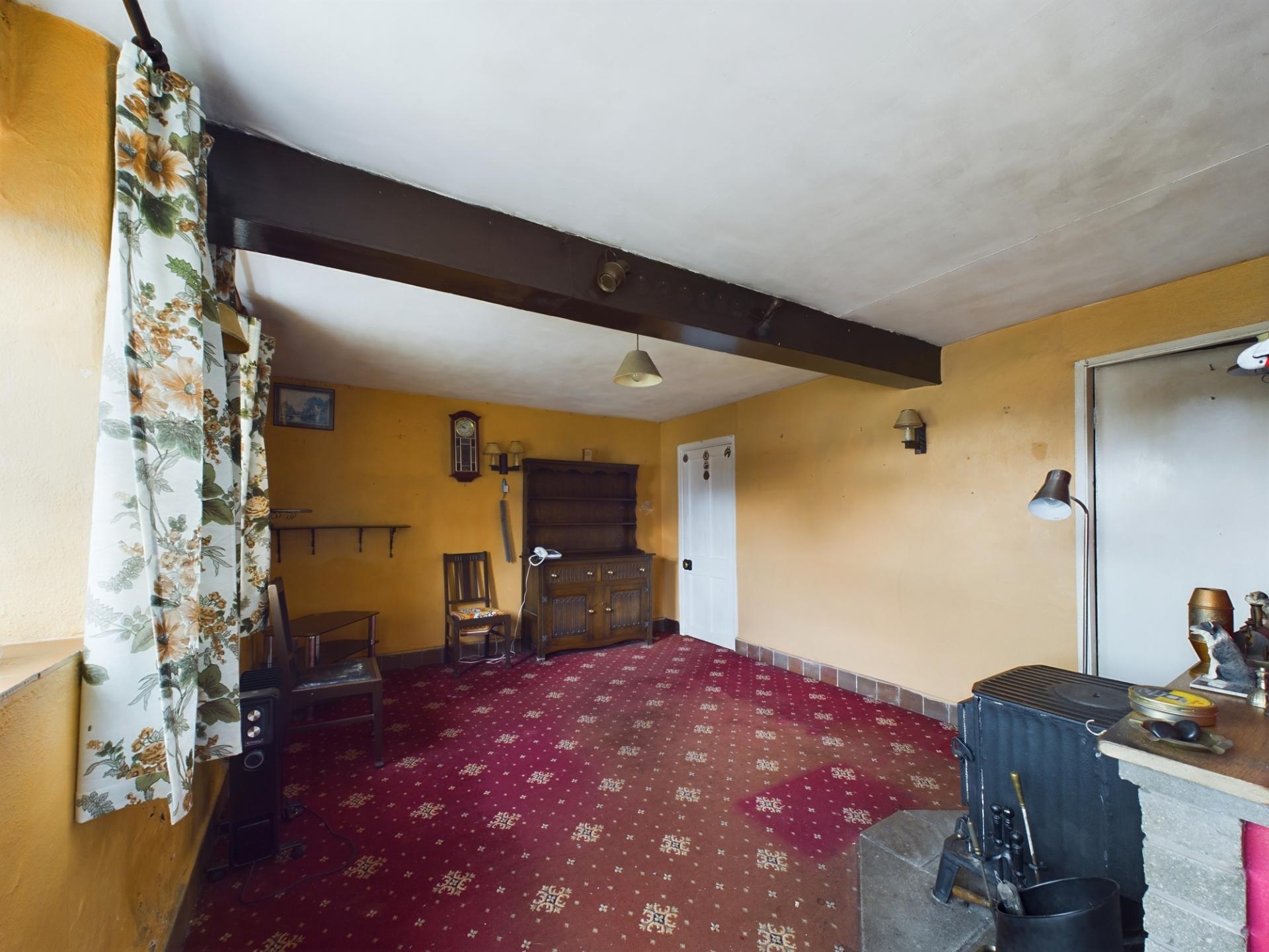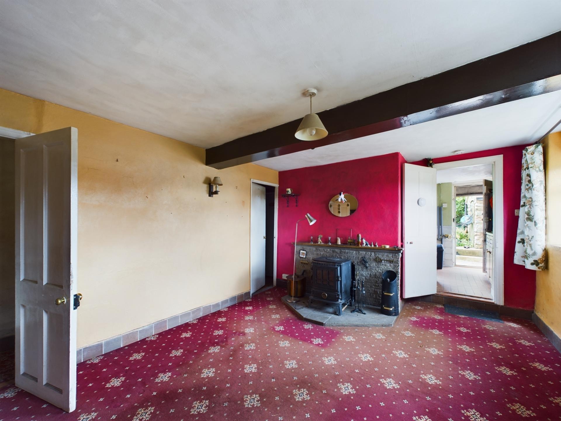 The main entrance has a canopied porch and leads into the kitchen with a quarry tiled floor and a side garden aspect. There are a range of wall and base units with work surfaces over and stainless steel sink. There is standing space and plumbing for an electric cooker, fridge/freezer and washing machine. The sitting/dining room has two windows to the front garden and countryside views beyond. To the centre of the room is a wood burning stove on a slate plinth and there is an under-stairs storage cupboard.
