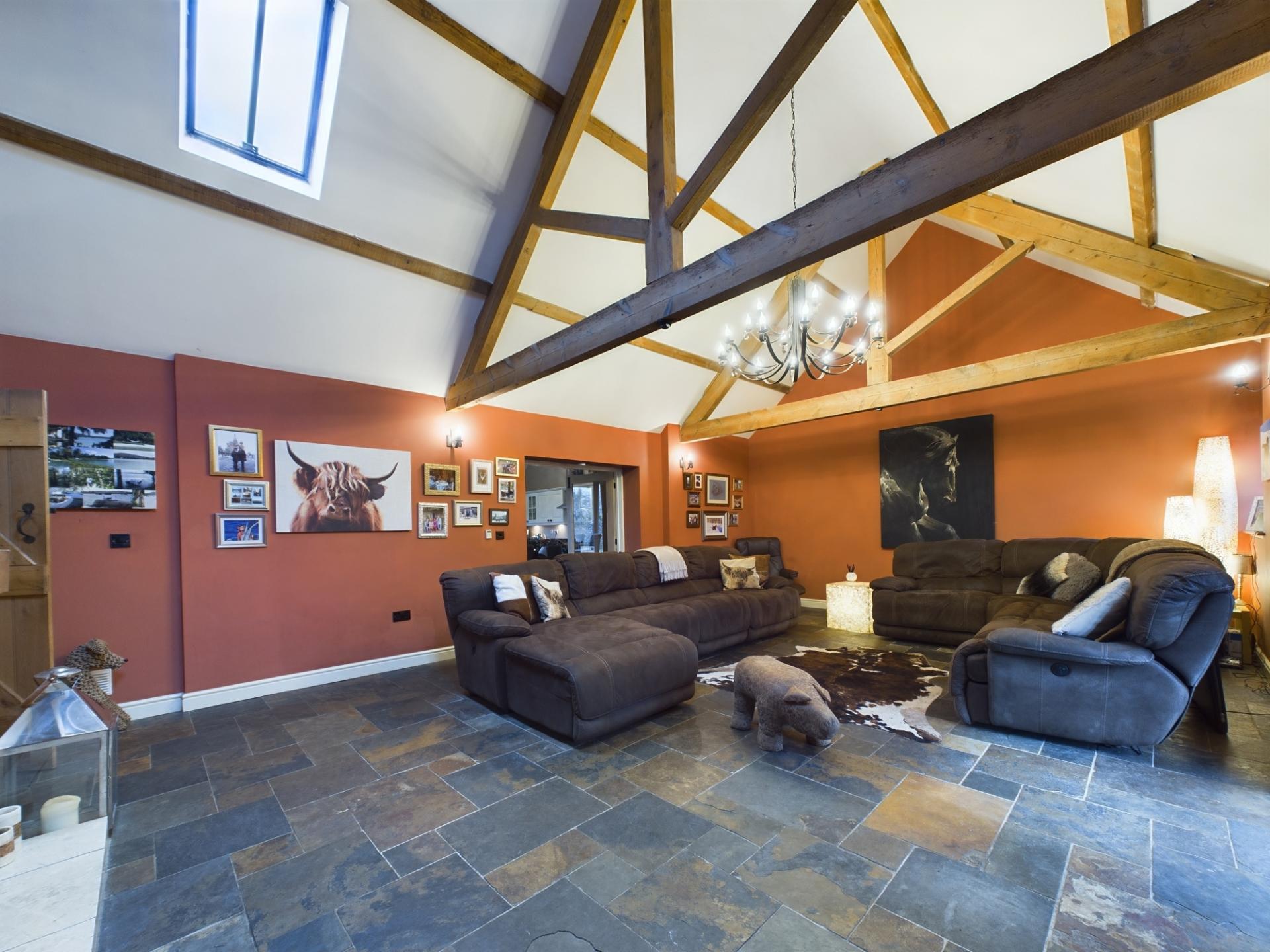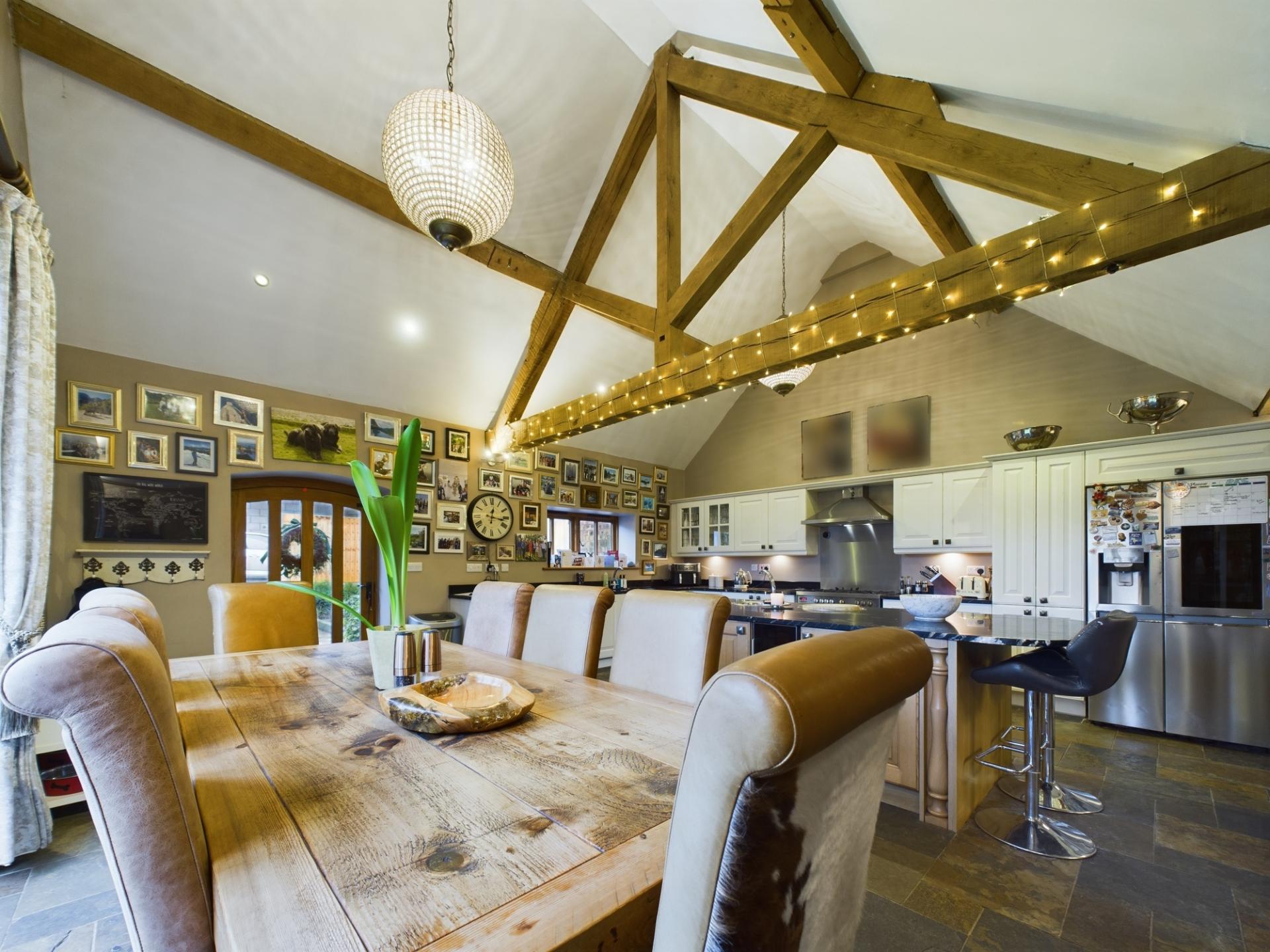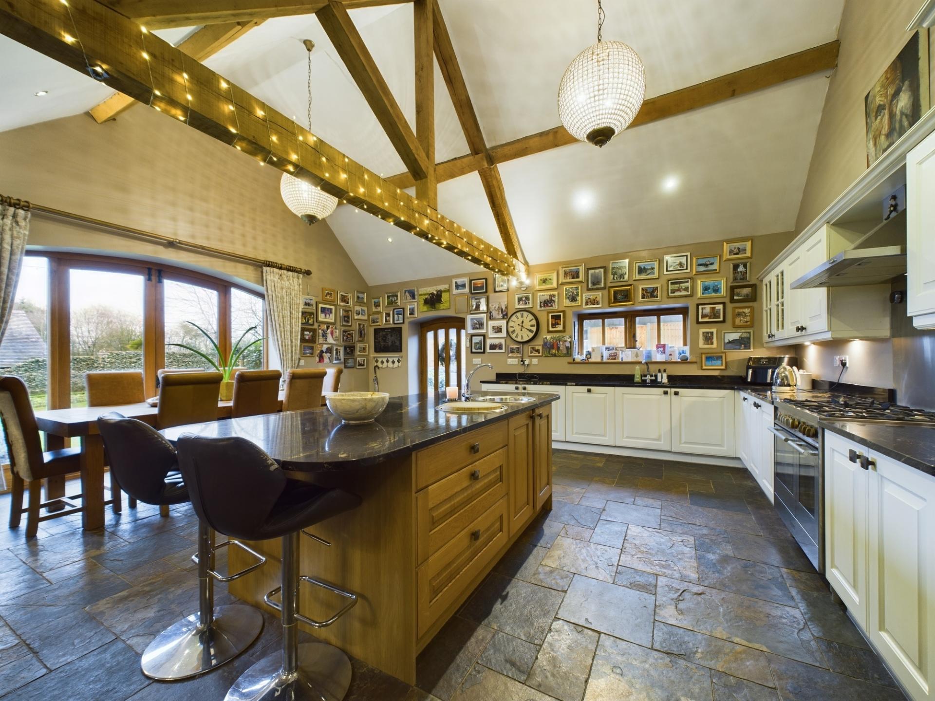 The sitting room has a vaulted ceiling with exposed timbers, Velux windows and rustic slate flooring. To the centre of the room is a contemporary wood burning stove with log storage to either side. Double doors open into the kitchen/dining/family room. The kitchen has a floor to ceiling window with rear garden view and doors provide access to the lawn. The kitchen has range of wall and base units and breakfast island with Cosmic black granite work surfaces over. Integrated appliances include a gas range cooker with extractor over, dishwasher and wine fridge. There is plumbing and standing space for an American fridge freezer and washing machine. A door provides access to the rear terrace.