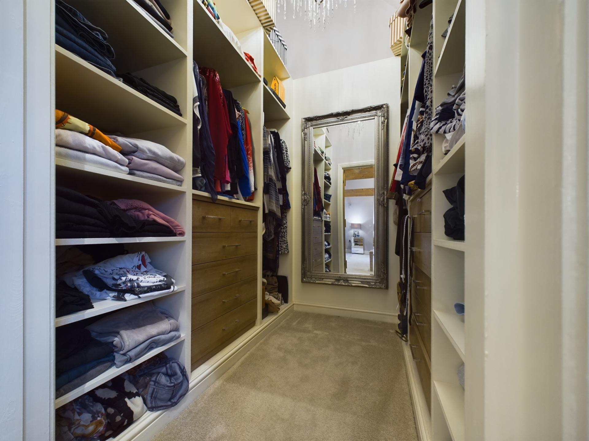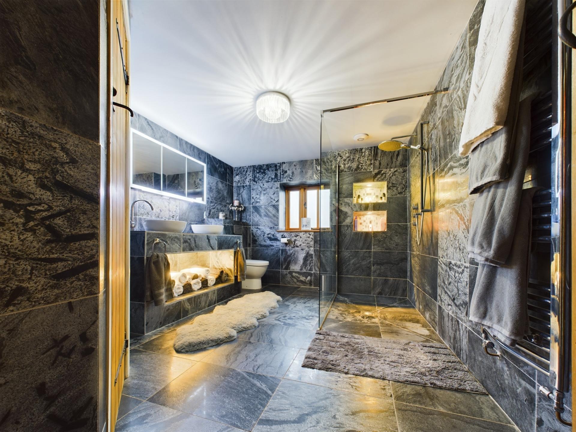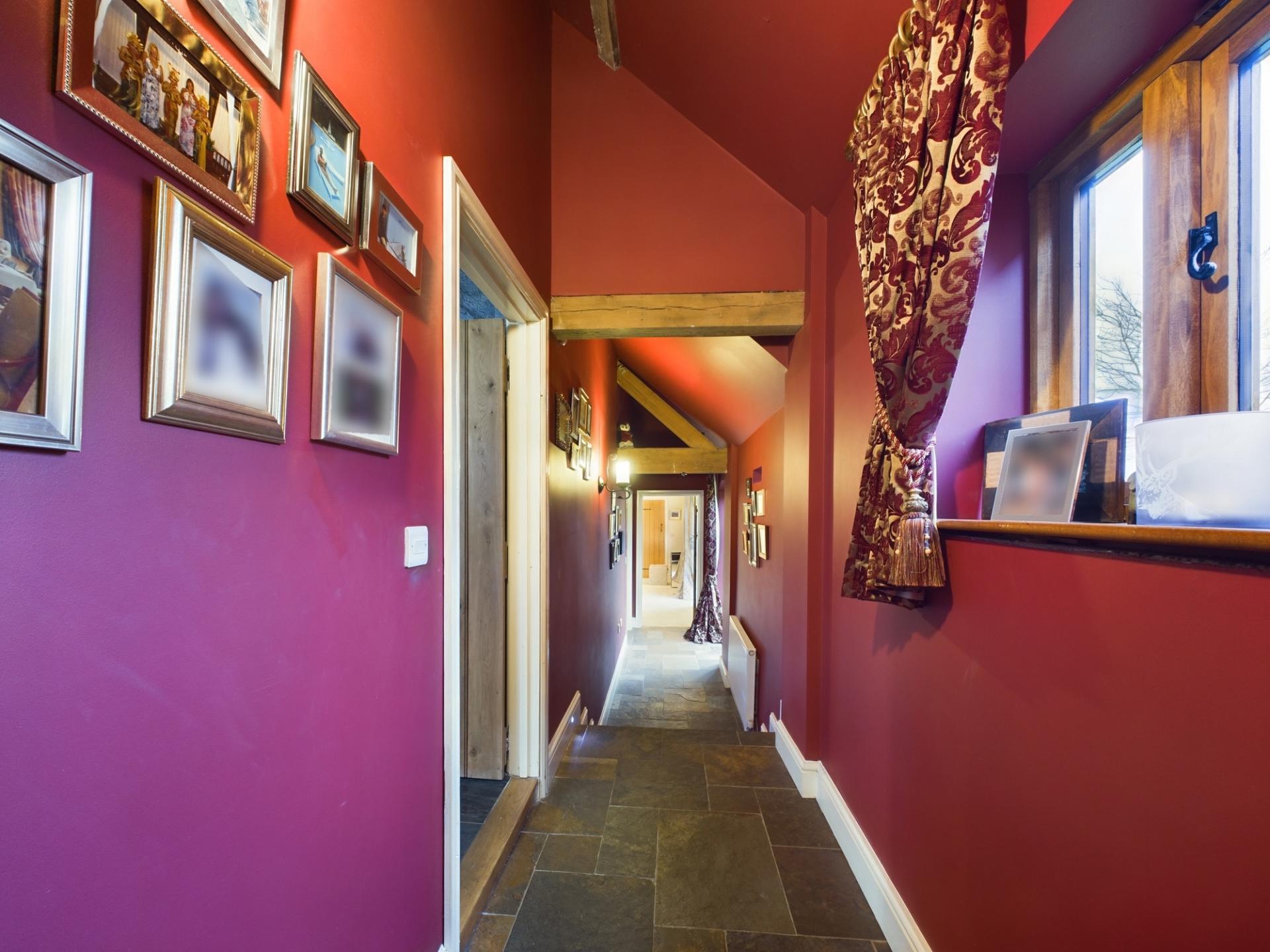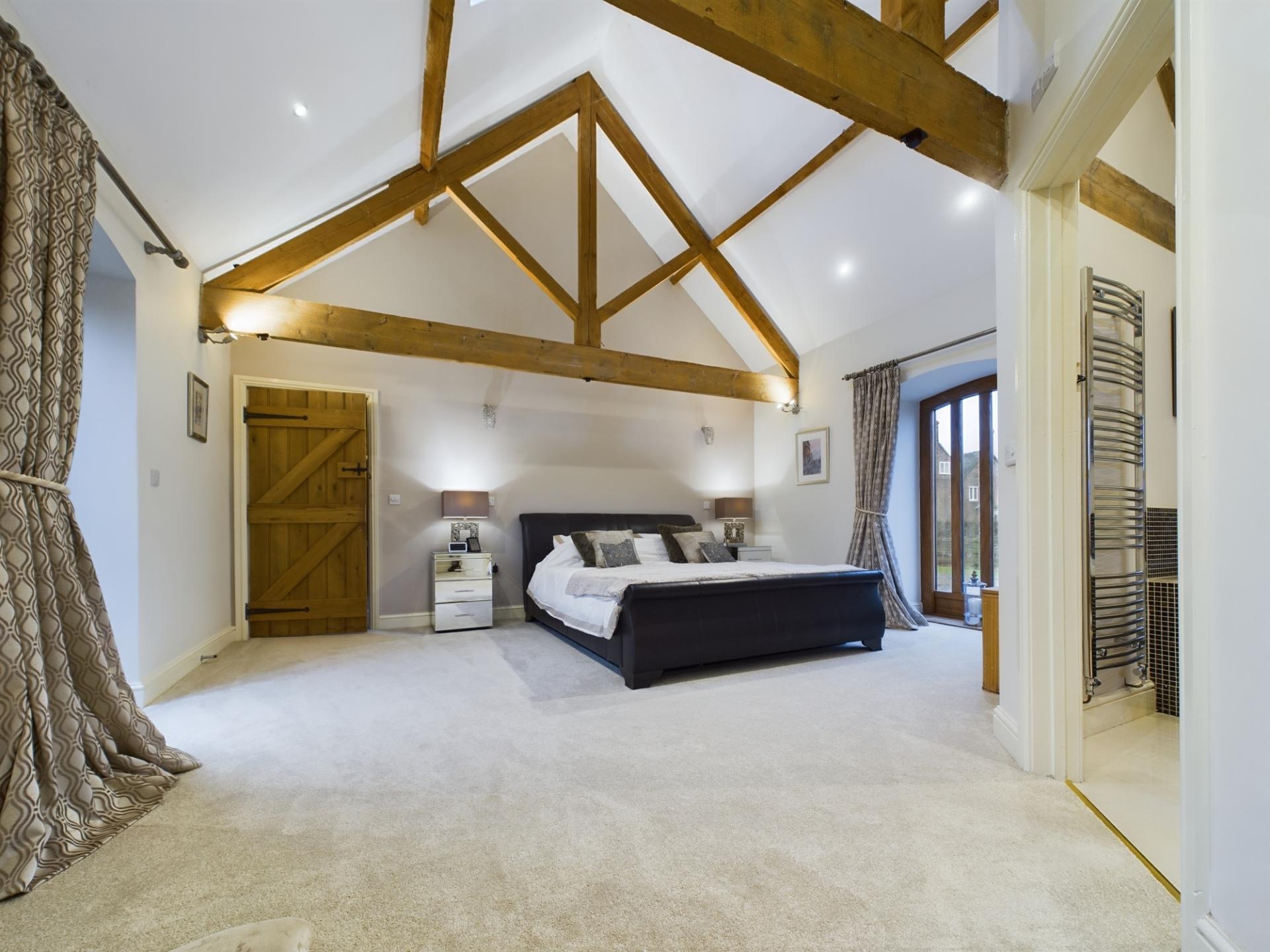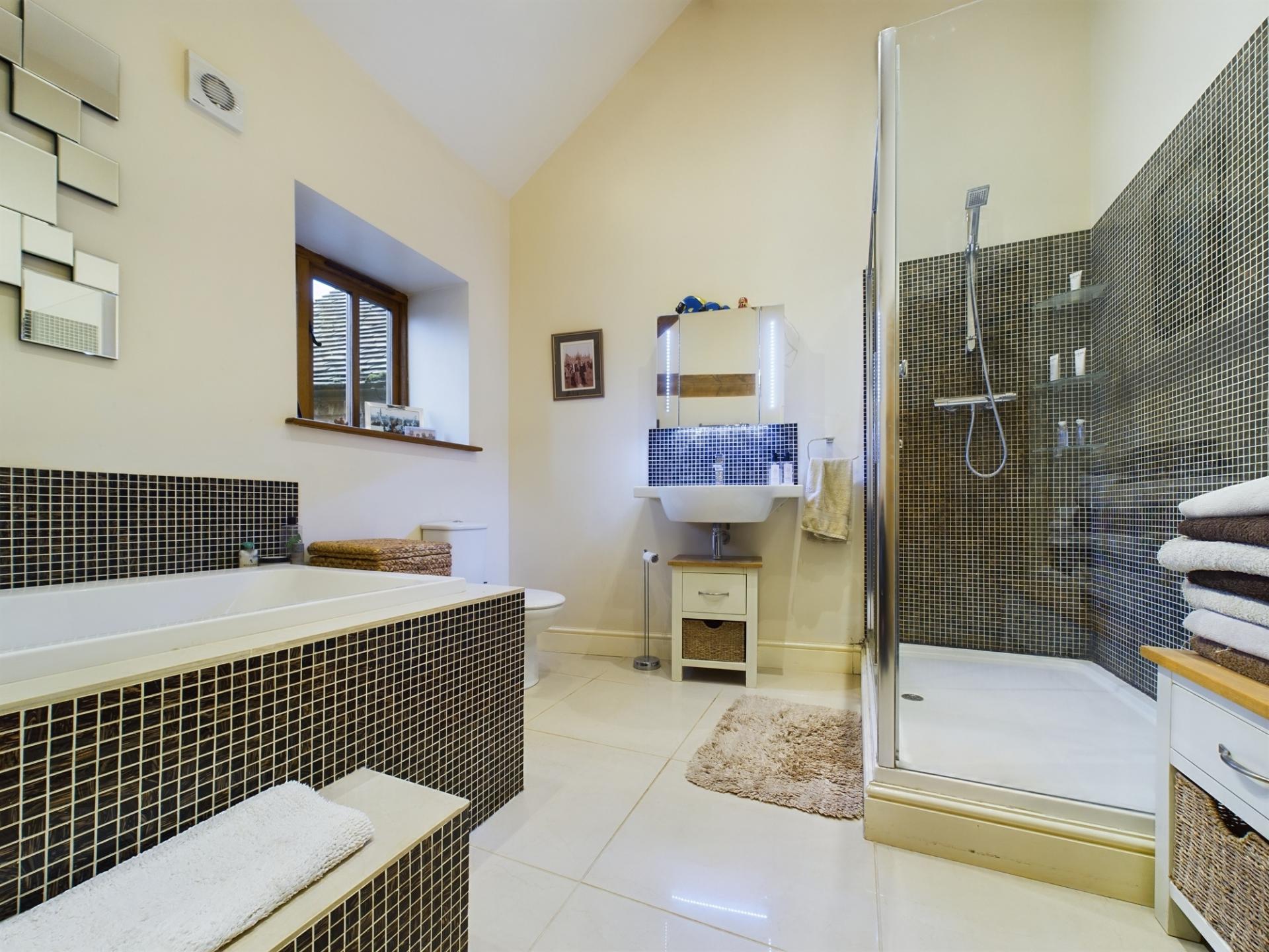 A tiled hallway with a rear garden aspect leads to the master suite , bedroom 2 and bathroom. The master suite has dual aspect windows, a vaulted ceiling with exposed timbers, walk -in dressing room and en-suite bathroom. The bathroom consists of deep bath with mosaic tiling to the sides, shower cubicle with mains shower, pedestal wash hand basin and WC. Bedroom two is a large double bedroom with a front aspect, vaulted ceiling and exposed timber with fitted wardrobes to one wall. The bathroom has floor to ceiling silver grey Quartzite tiling and consists of a walk in double shower with mains shower, side screen, two wash hand basins within a vanity unit and WC. A walk-in cupboard provides additional storage.
