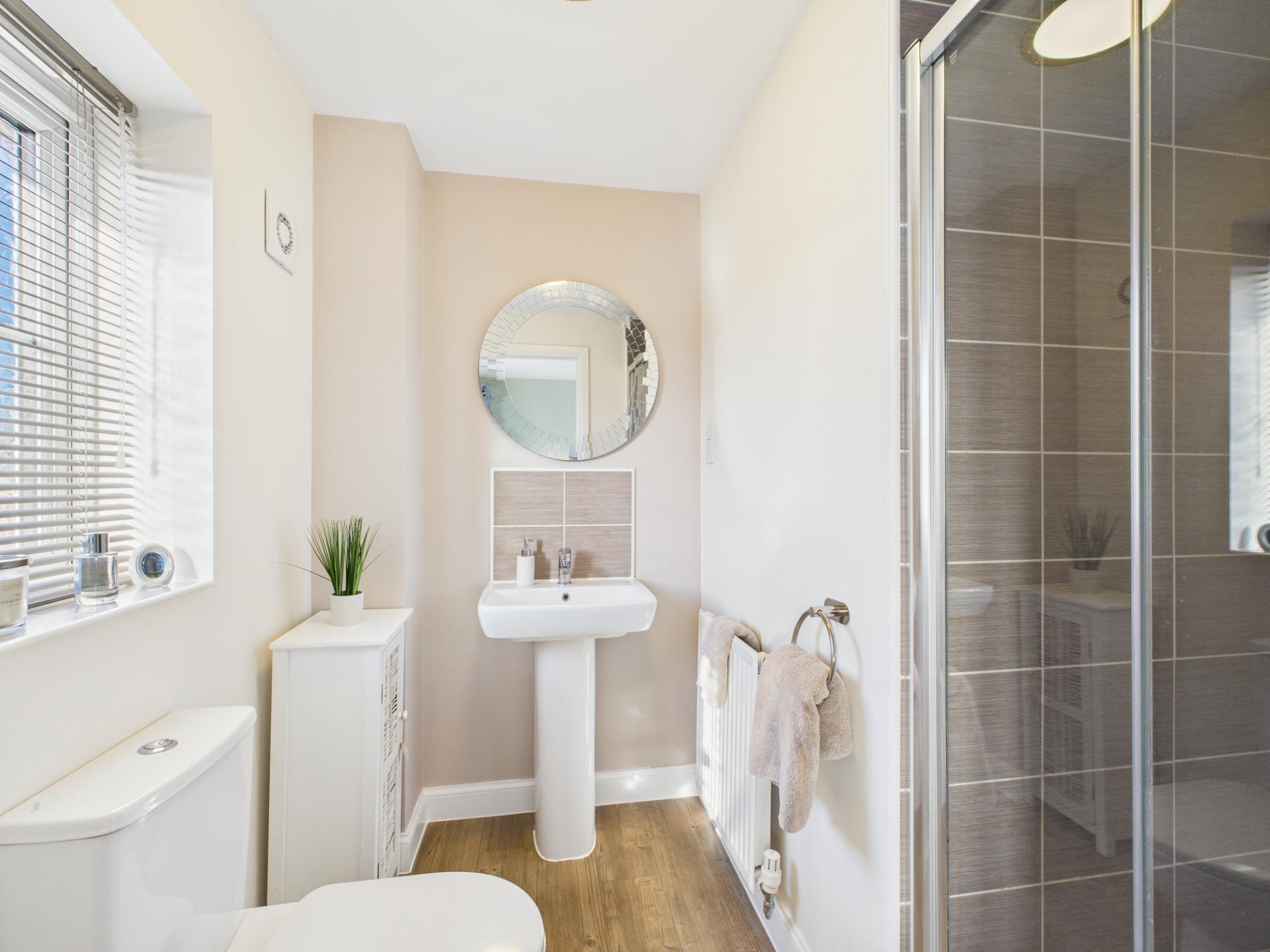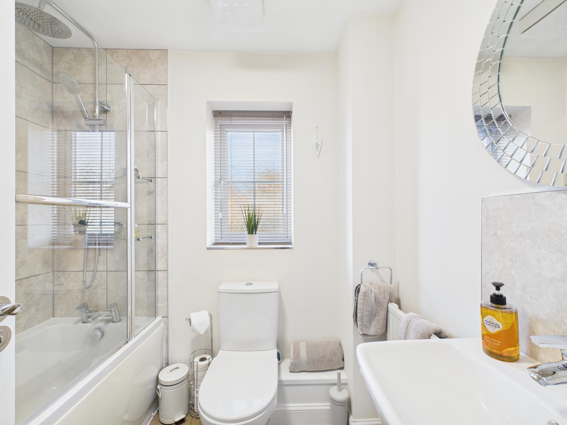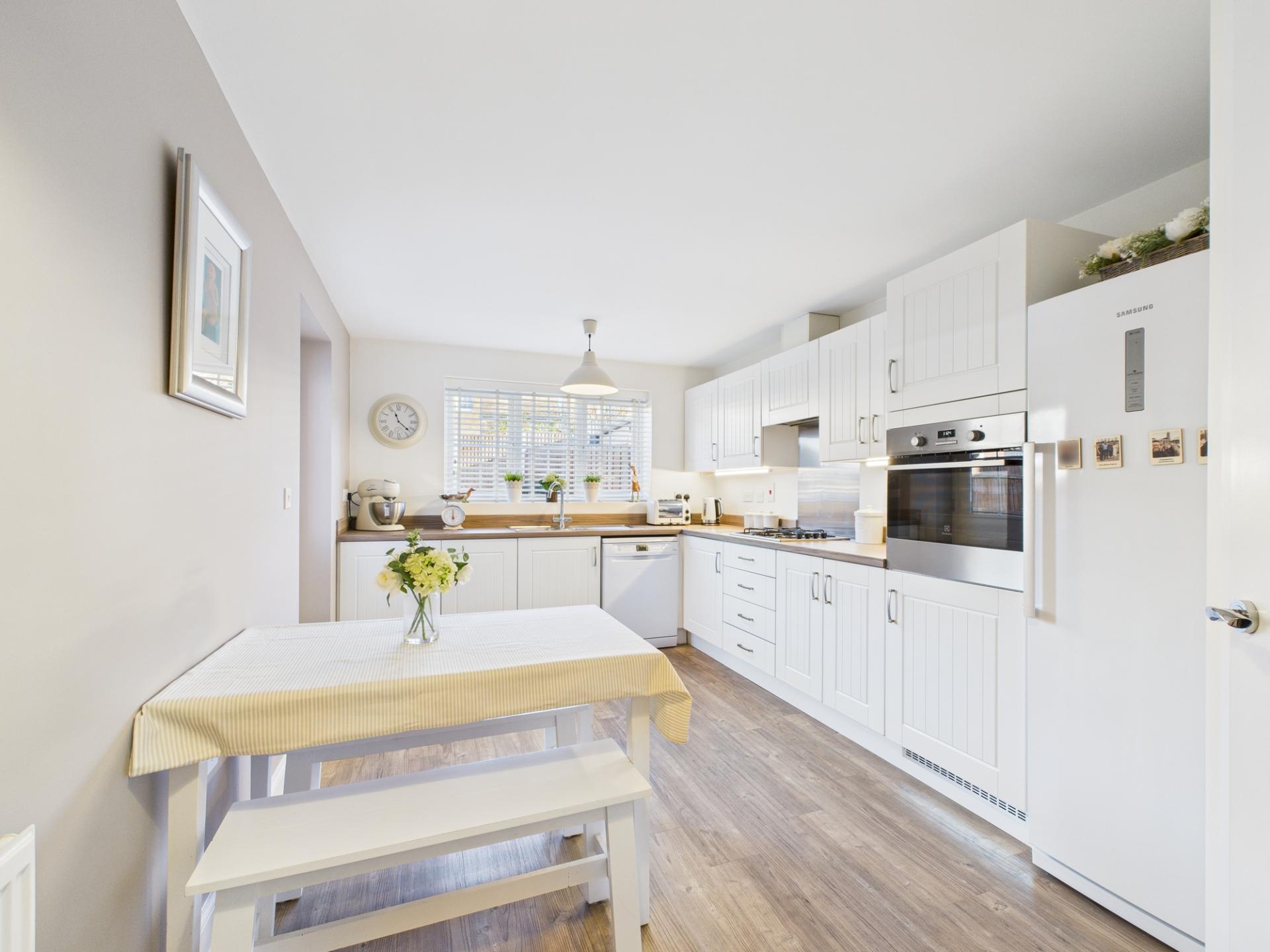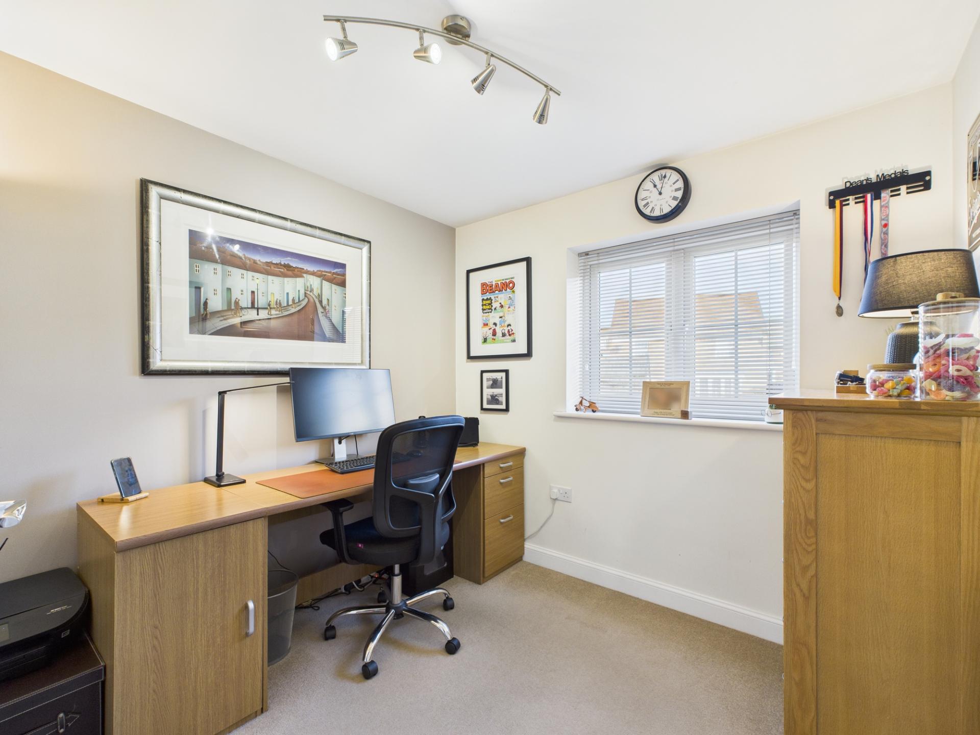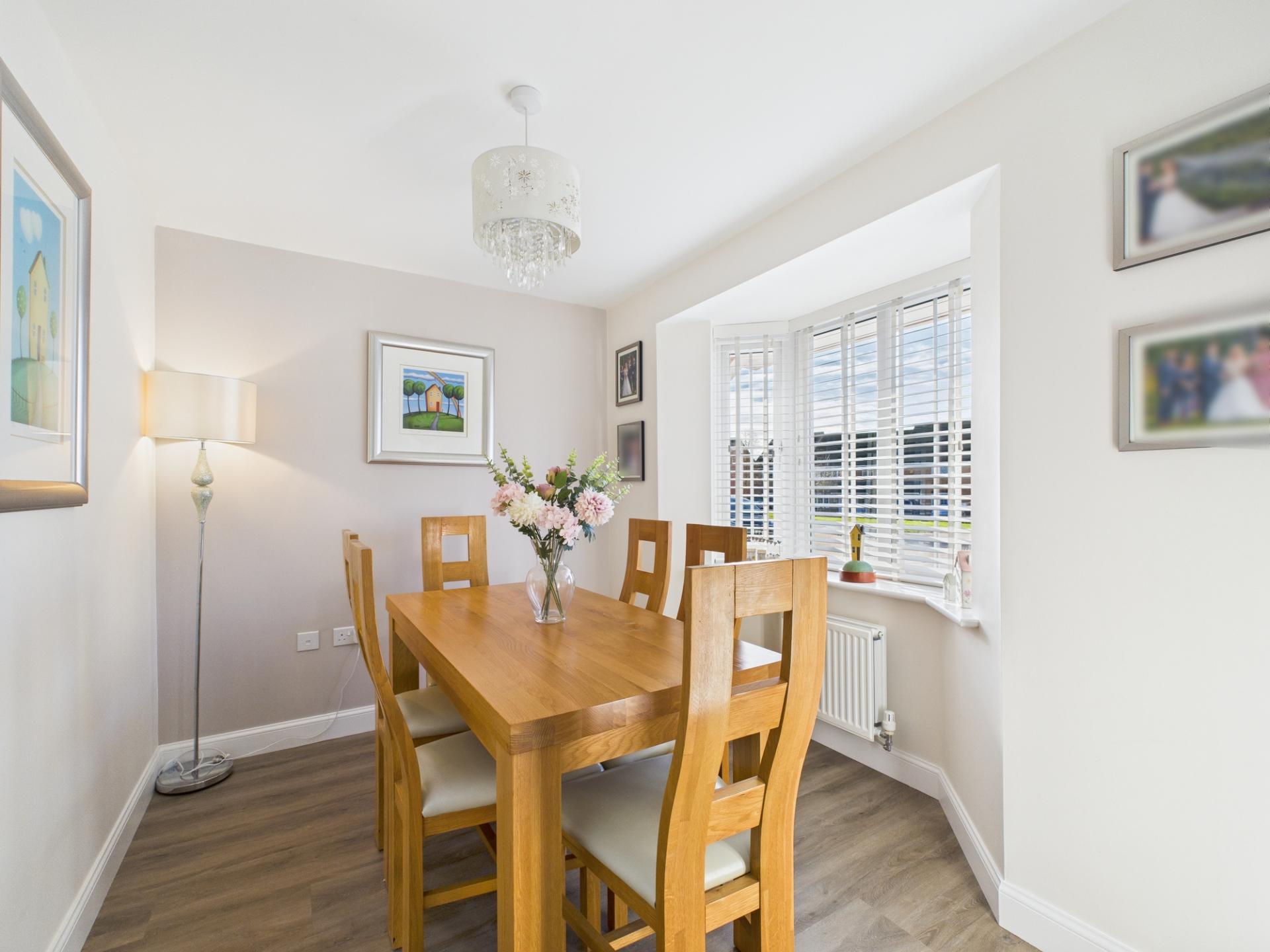 The ground floor is meticulously planned and features two capacious living rooms, one graced with a bay window and the other with french doors leading to a well-maintained rear garden, which create an inviting space for harmonious living Additionally, this floor accommodates a proficiently designed kitchen complete with a built-in oven, hob, space for a dishwasher, and a fridge/freezer. The kitchen is spacious enough to include a dining table for those family meal times. There is also versatile dining room that also offers the option of being utilized as an office, a utility room with space for appliances, and a convenient WC.