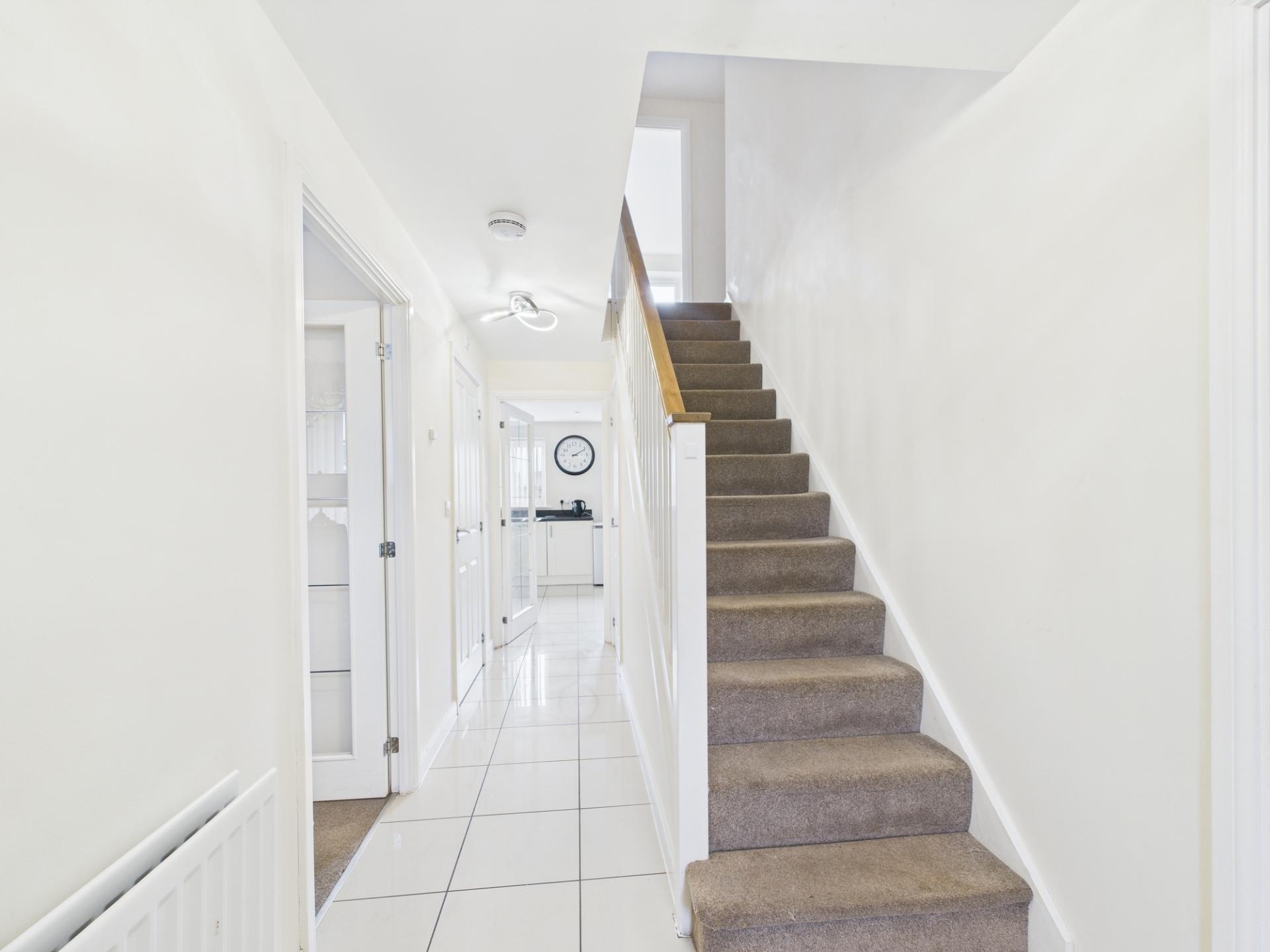 Gives entry to the through hallway, which provides access to the living room, study, utility/WC, kitchen/diner and staircase ascending to the first floor.
