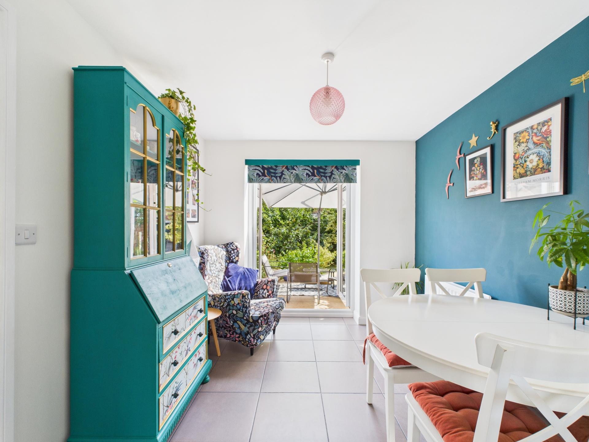 Offering a vibrant blend of comfortable living spaces and appealing modernity. As you enter, the ground floor welcomes you with a, a laundry room designed to accommodate your appliances, and a functional WC. The kitchen is fully equipped with built-in oven and hob for culinary enthusiasts. The heart of this level is the dining room that opens onto the rear garden via elegant French doors. The living room, bathed in ample natural light, offers a welcoming ambiance.