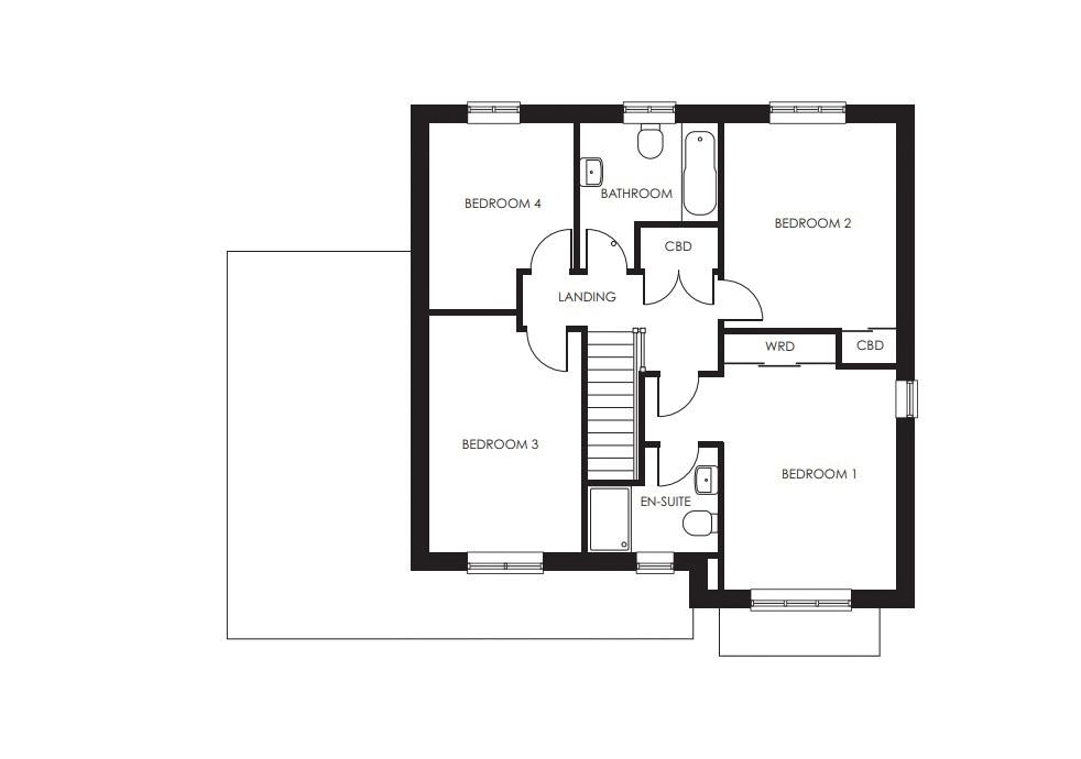 Moving upstairs, the Grasmere boasts four well-appointed bedrooms. The principal suite, bedroom one, is a haven of tranquillity, complete with built-in wardrobes and an en-suite bathroom, offering privacy and luxury. Bedrooms two and three provide ample space, making them ideal guest or teenager rooms. Bedroom four is perfectly suited as a children’s room or a functional home office.
