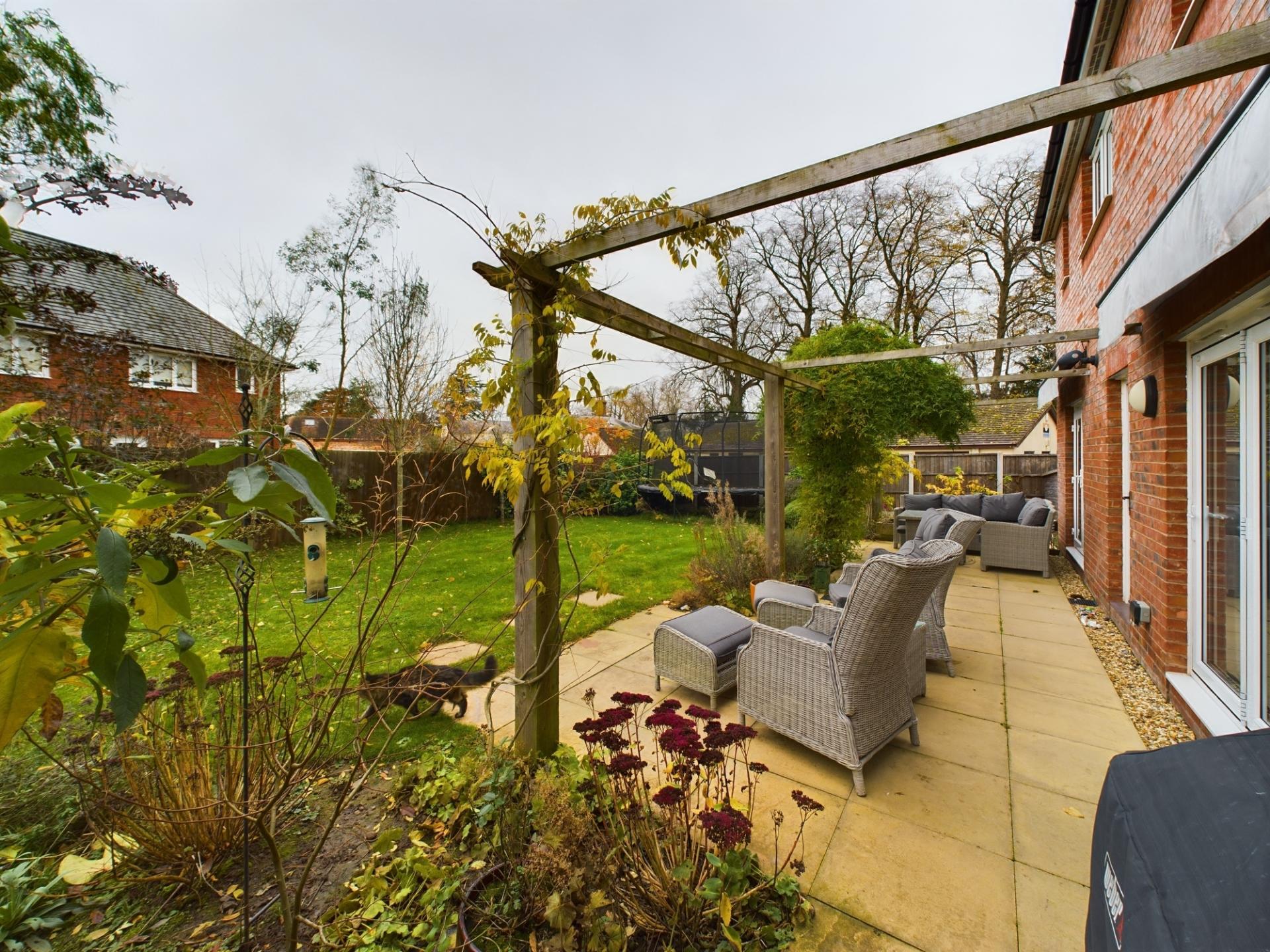 The property is approached over a tarmacadam driveway leading to the main entrance, double garage and gated side access to the rear garden. The garden to the front is laid to lawn with a border of established shrubs and an ornamental hedge. The rear garden has a large paved seating and entertaining area with a timber pergola over. The garden is fully enclosed making this ideal for children and pets and is mainly laid to lawn with mature borders filled with shrubs, specimen trees and perennial plants. To the side of the property is a vegetable garden with raised beds. The double garage has an up and over door, light and power.