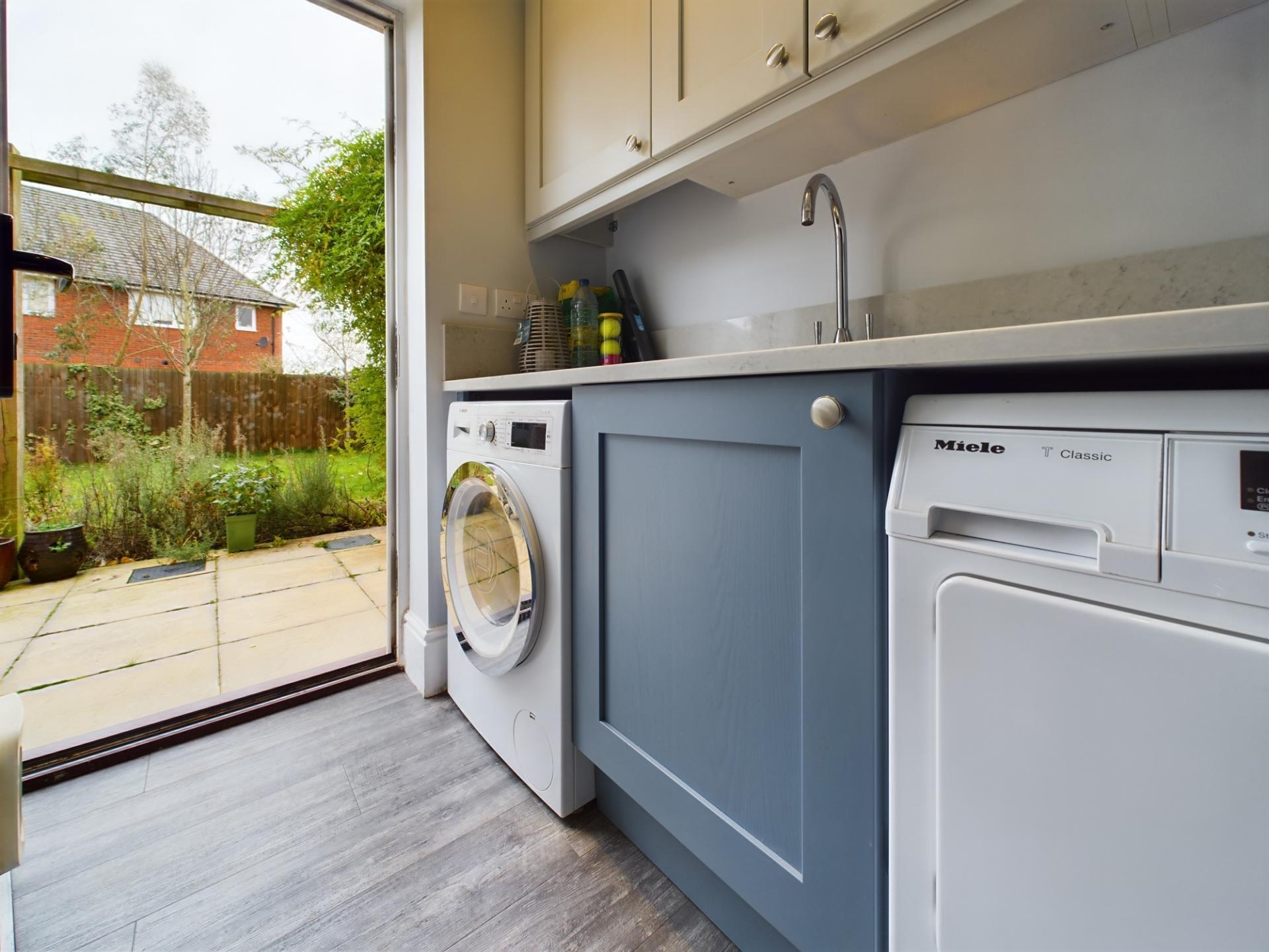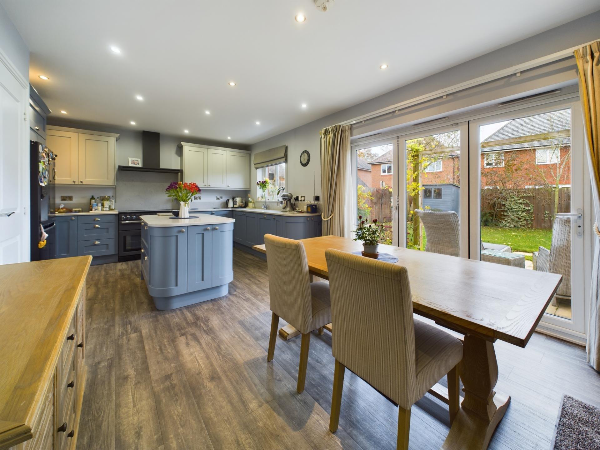 The entrance hall has a guest cloakroom, under-stairs cupboard and stairs to the first floor landing. The sitting room has a large bay window to the front and an electric fire within a contemporary surround. The dining room/reception 2 has French doors opening onto the patio and is currently used as a family/play room. The kitchen dining room has a rear garden aspect with bi-fold doors opening onto the rear garden patio. The kitchen has a range of wall and base units and island with quartz worksurfaces over. Integrated appliances include an induction Range cooker with extractor over and dishwasher. There is standing space and plumbing for American fridge and freezer. There is also a useful walk in pantry. The laundry/boot room is accessed from the kitchen and a door provides access to the rear garden. There are a range of wall and base units with worksurfaces over, sink and draining board. There is plumbing and standing space for a washing machine and a tumble drier.