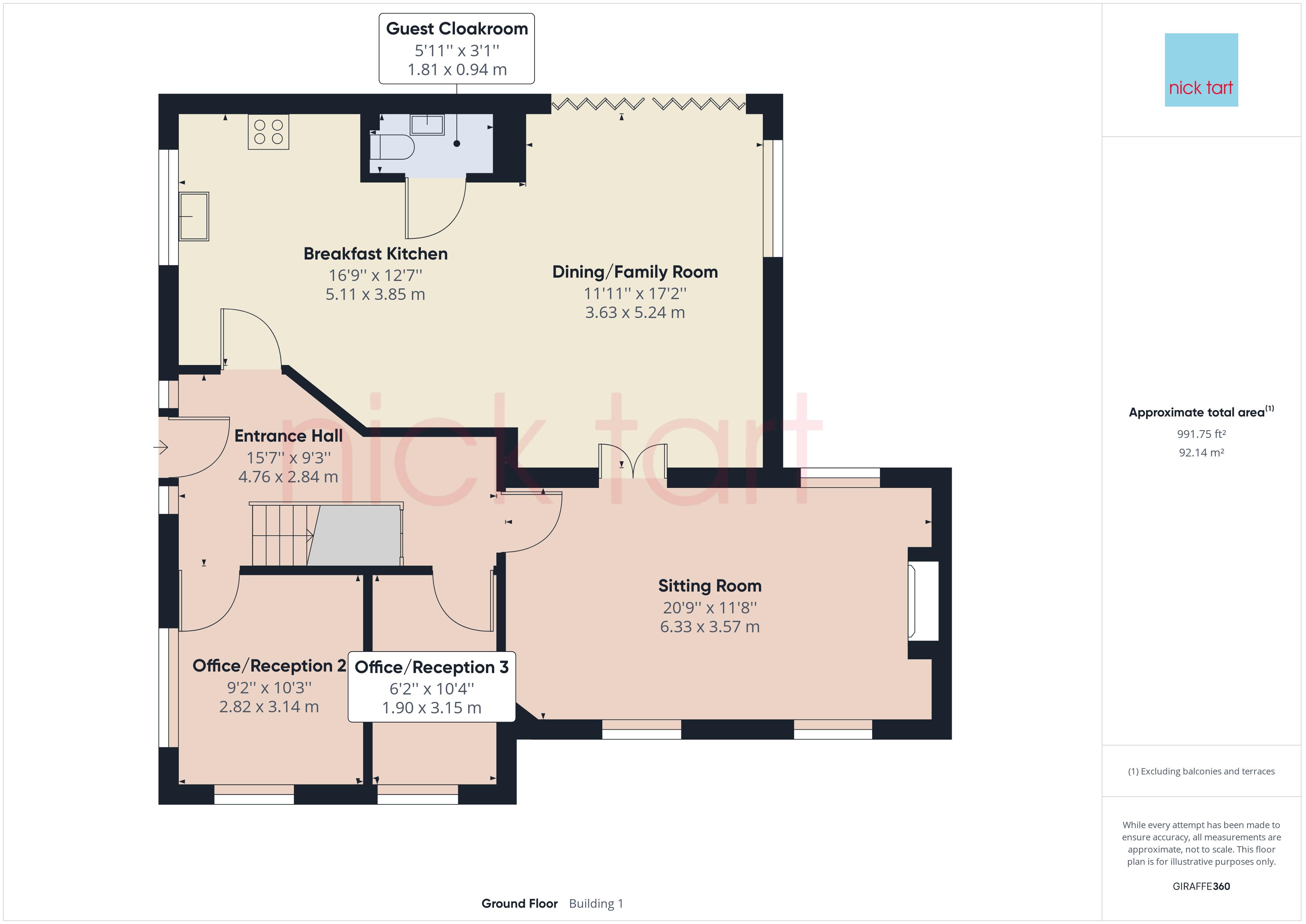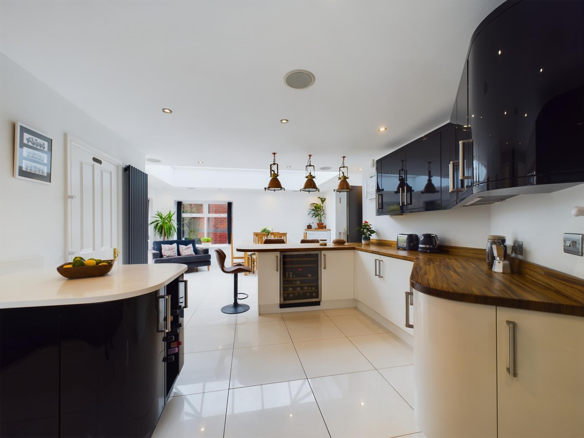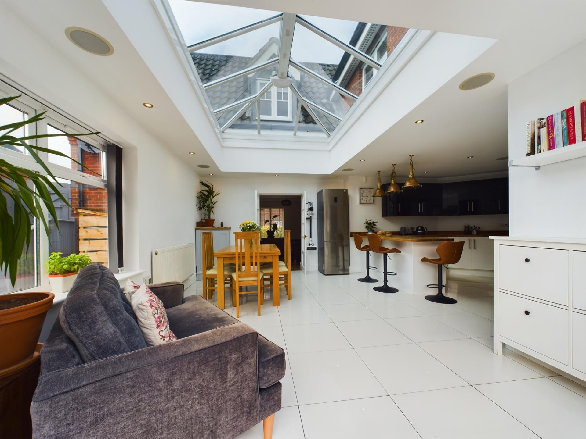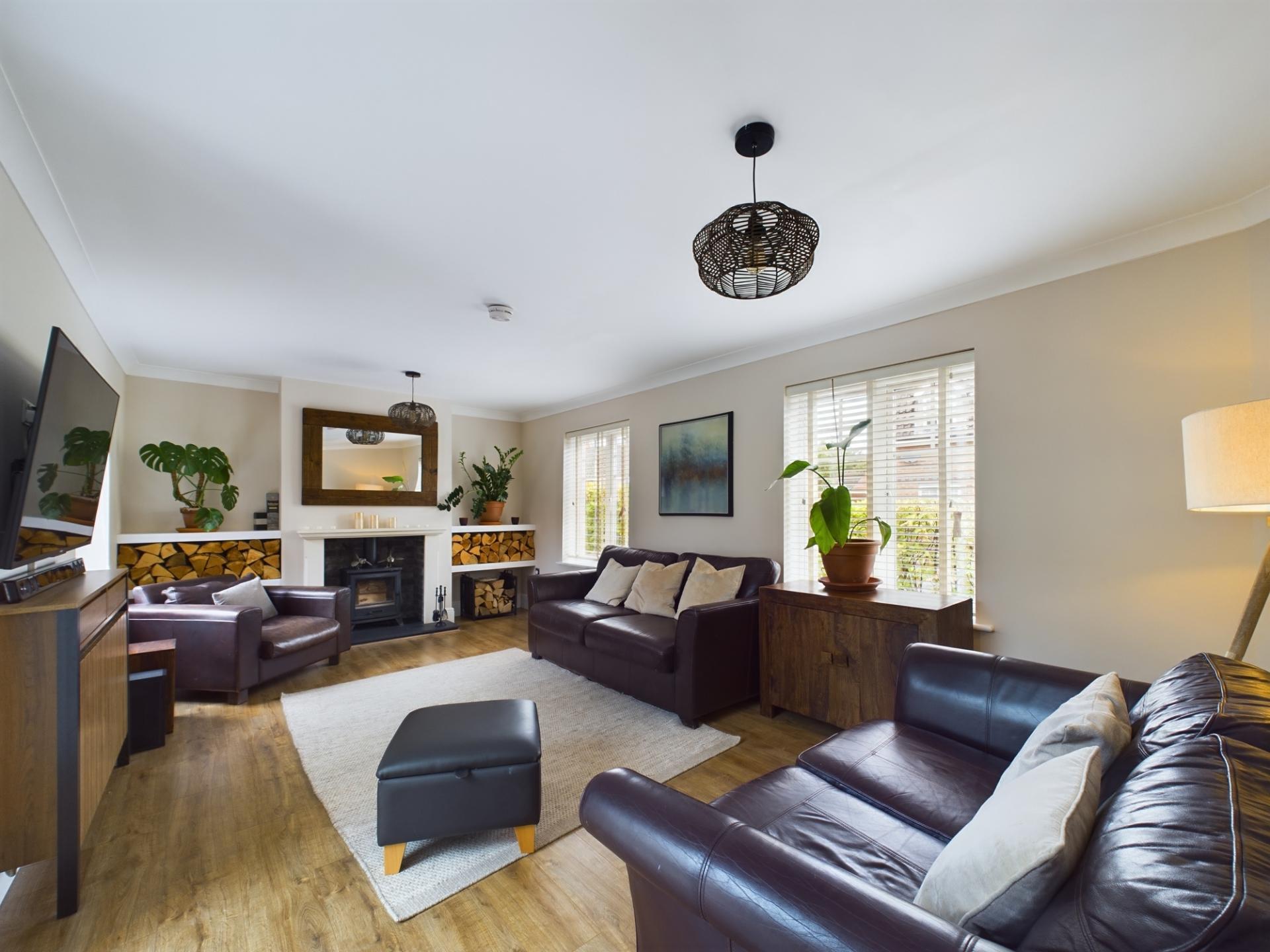 The entrance hall has stairs to the first floor and access to the kitchen/dining/family room and all reception rooms. The kitchen /dining/family room has a dual aspect windows to the front and rear gardens and includes bi-fold doors within the orangery which open onto the rear garden terrace. The kitchen has a range of high gloss contemporary wall and base units and breakfast bar all of which have a combination of white quartz and wood work surfaces over. Integrated appliances include a 5 ring gas hob with extractor over, two double electric ovens, dishwasher,microwave, fridge, freezer, washing machine and wine fridge. The guest cloakroom is accessed from the kitchen. Double doors open from the dining area into the sitting room with a wood burner to the centre of the room. Two further reception rooms are used by the current owners as office space for home working however would lend themselves to a play room or snug.