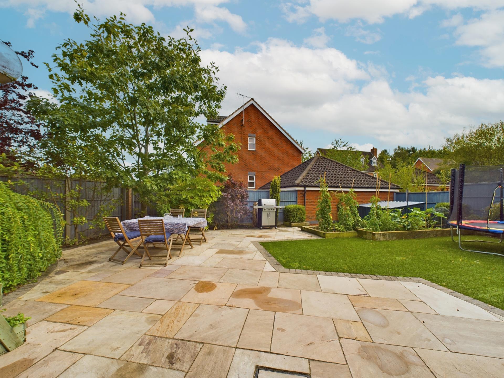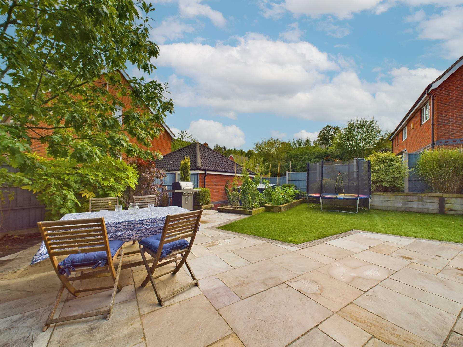Gated side access leads to a private rear garden consisting of an artifical lawn and large paved terrace ideal for outdoor entertaining. Raised beds edged with sleepers are well stocked with vegetables, shrubs, perennial plants and specimen trees. Steps lead down to a second paved patio currently used for outdoor storage.