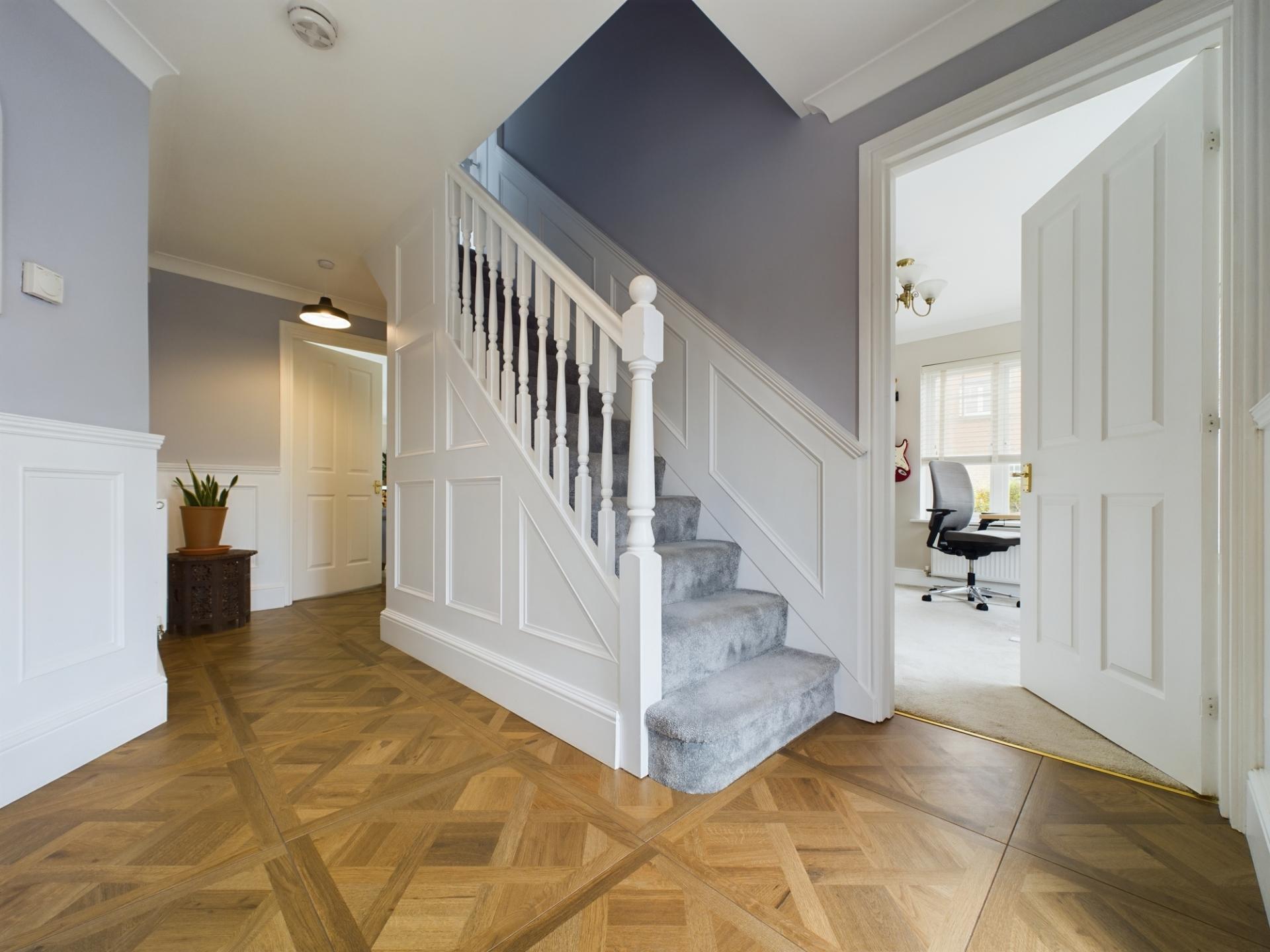 The master bedroom is a large double bedroom with dual aspect windows and a built in wardrobe. The en-suite shower room has floor to ceiling tiling and consists of a double walk in shower with mains shower, wash hand basin, LED de-mist mirror over and WC. Bedroom 2 is a good sized double bedroom with dual aspect windows. Bedrooms 3 and 4 are double bedrooms with a front aspect. The bathroom has a panelled bath with hand held shower over, wash hand basin within a vanity unit and WC. Access to an insulated loft is from bedrooms 1 and 3.