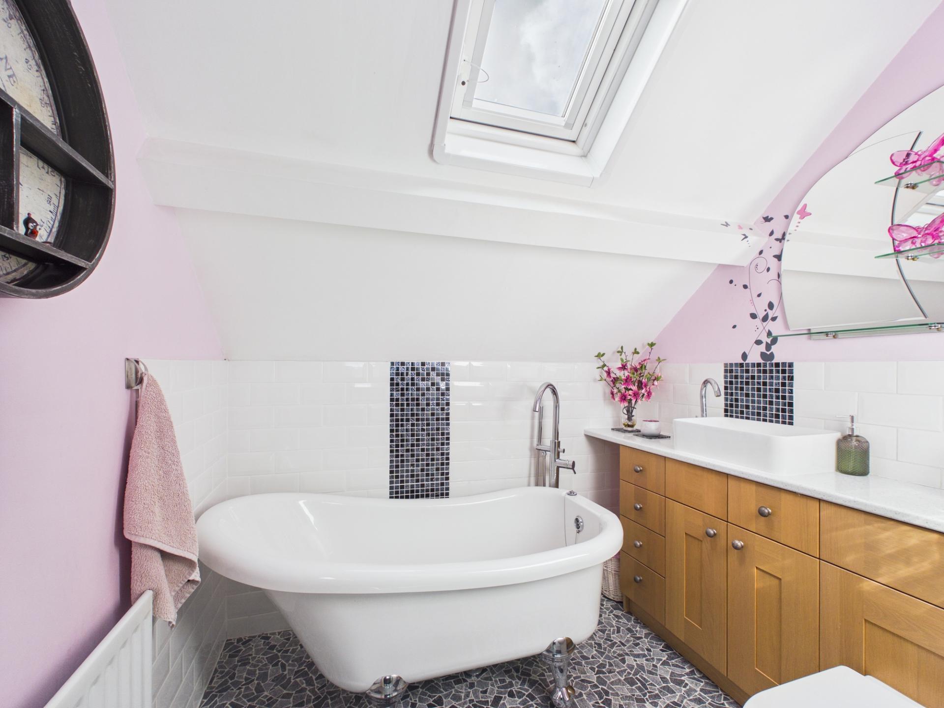 The first floor houses a further bathroom with a rolled top bath and two further bedrooms, one if which is furnished with a fitted wardrobe.