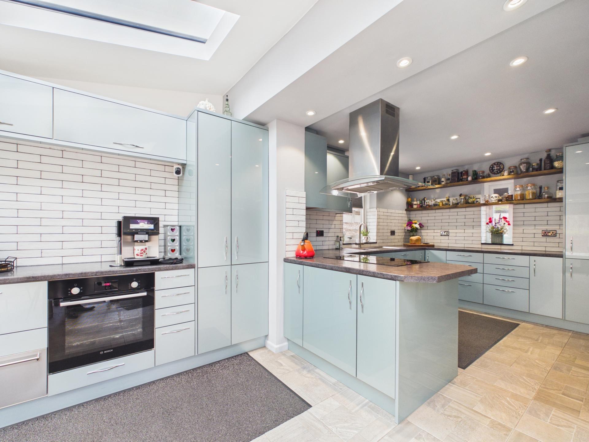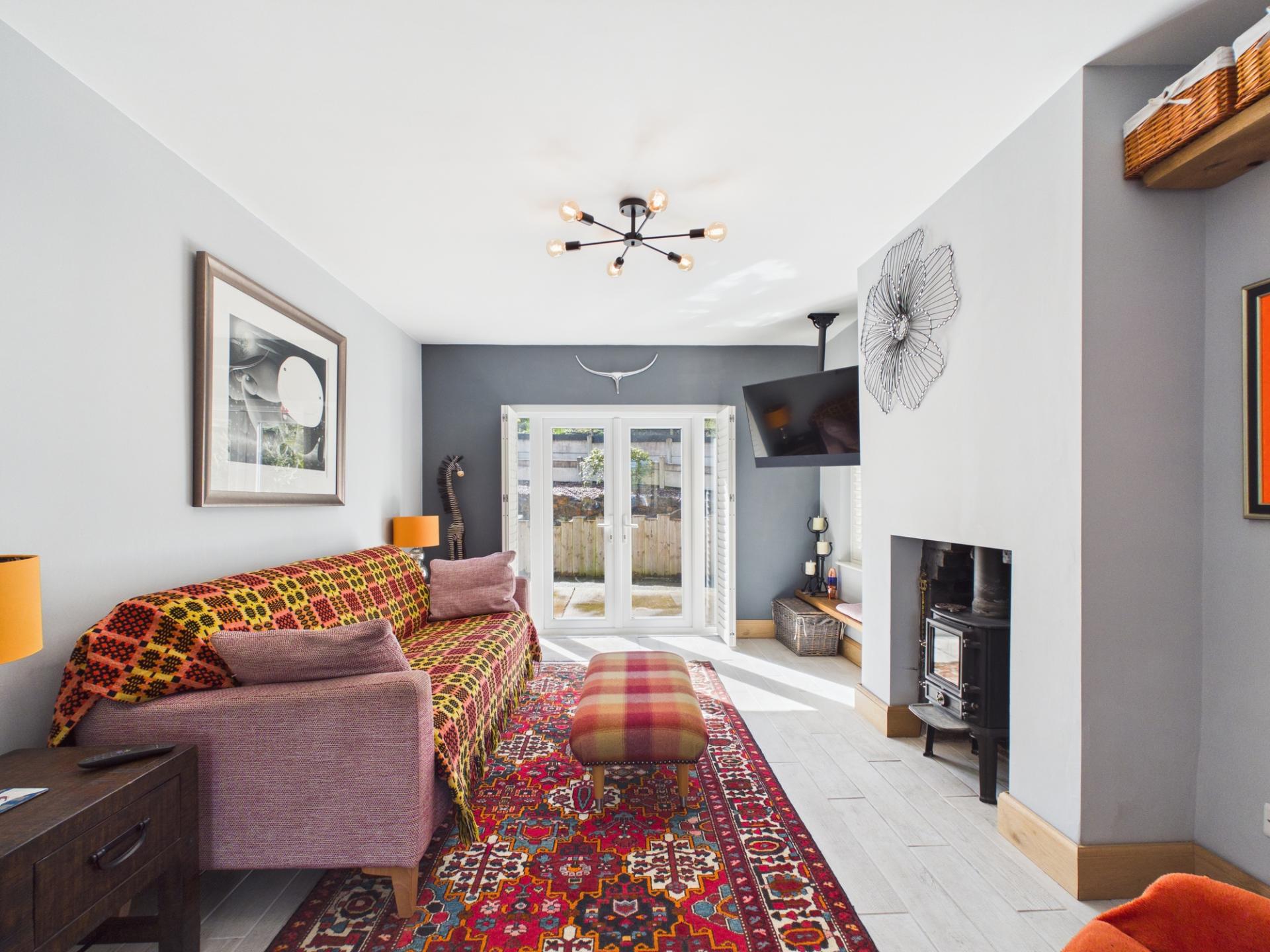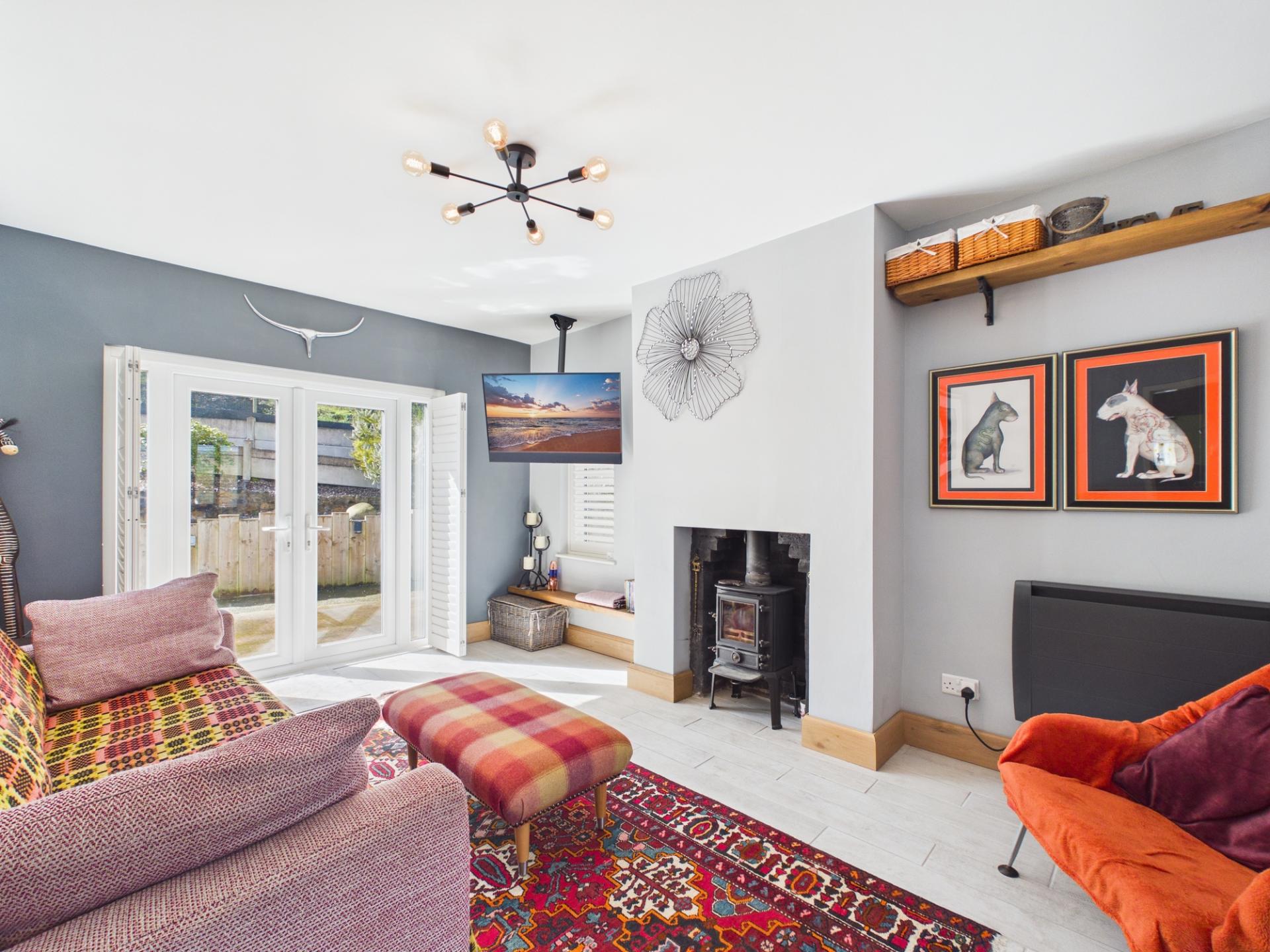 The ground floor offers a comfortable accommodation with a ground floor bedroom with bay window, two large reception rooms, featuring a wood burner, bay window, and French doors opening onto the garden. There is also a utility room, a handy ground floor Wet Room/WC, and a stylishly fitted kitchen/dining room featuring high gloss units, an oven, a hob, and skylight windows that bathe the dining area in natural light.