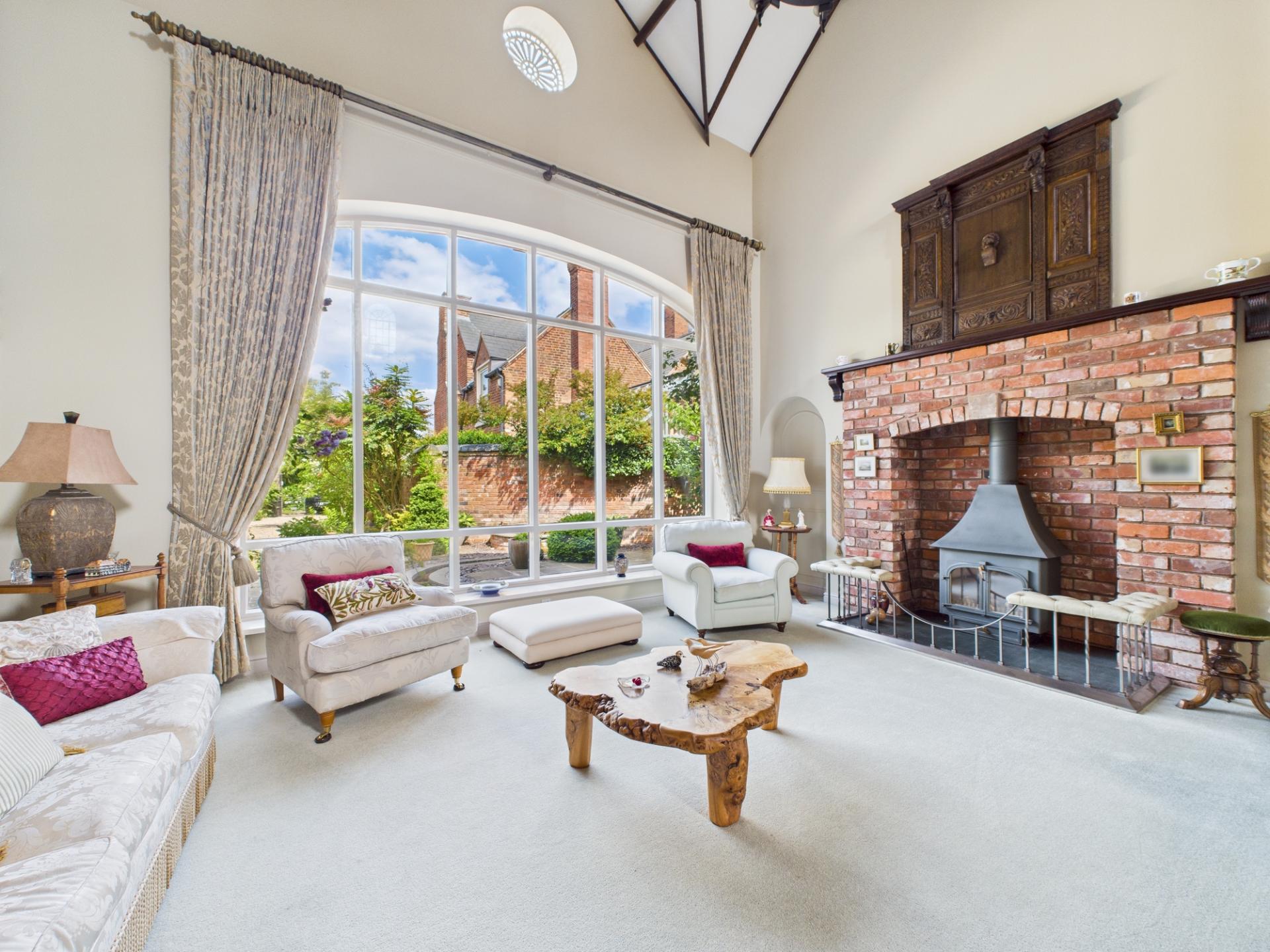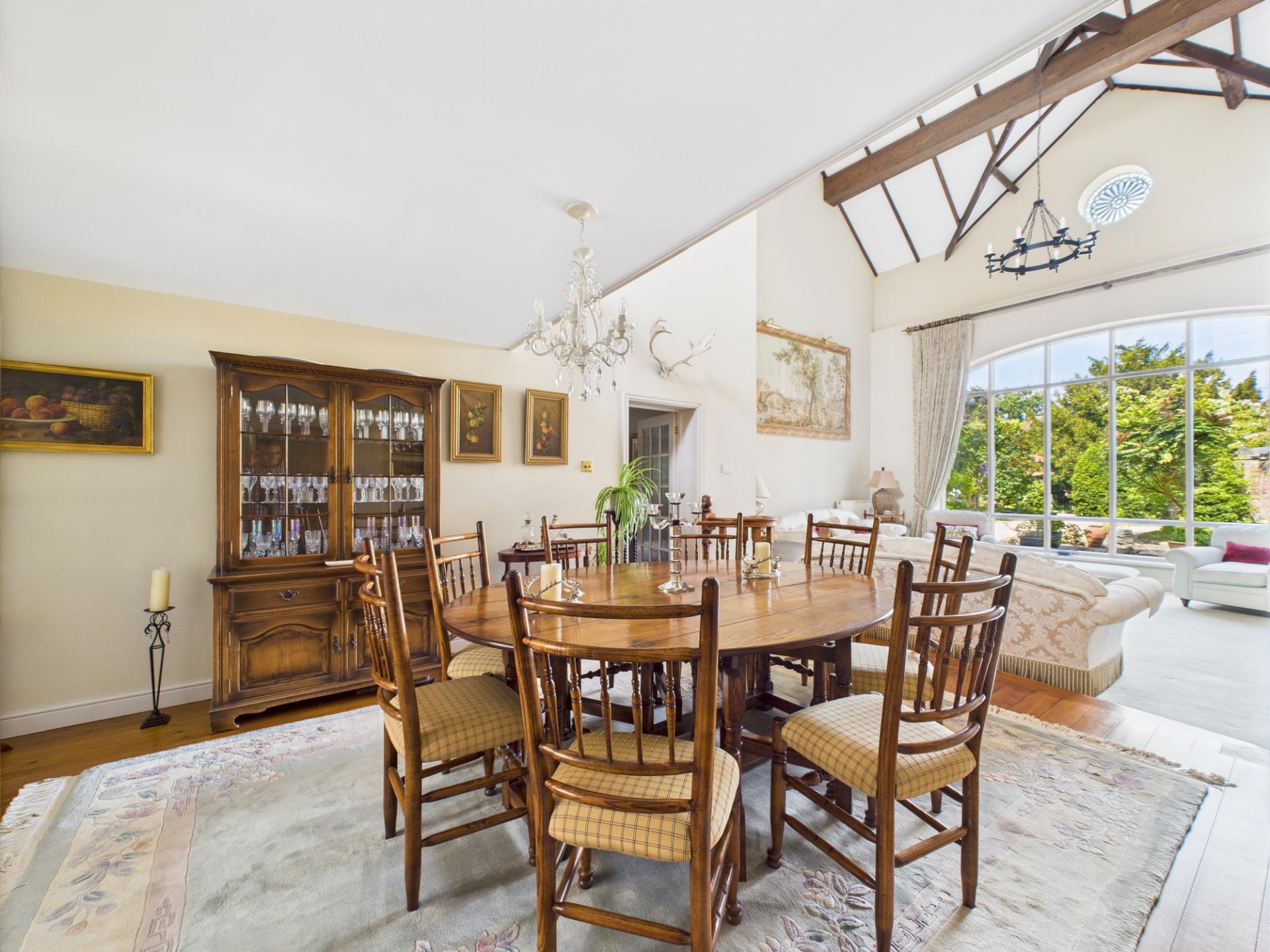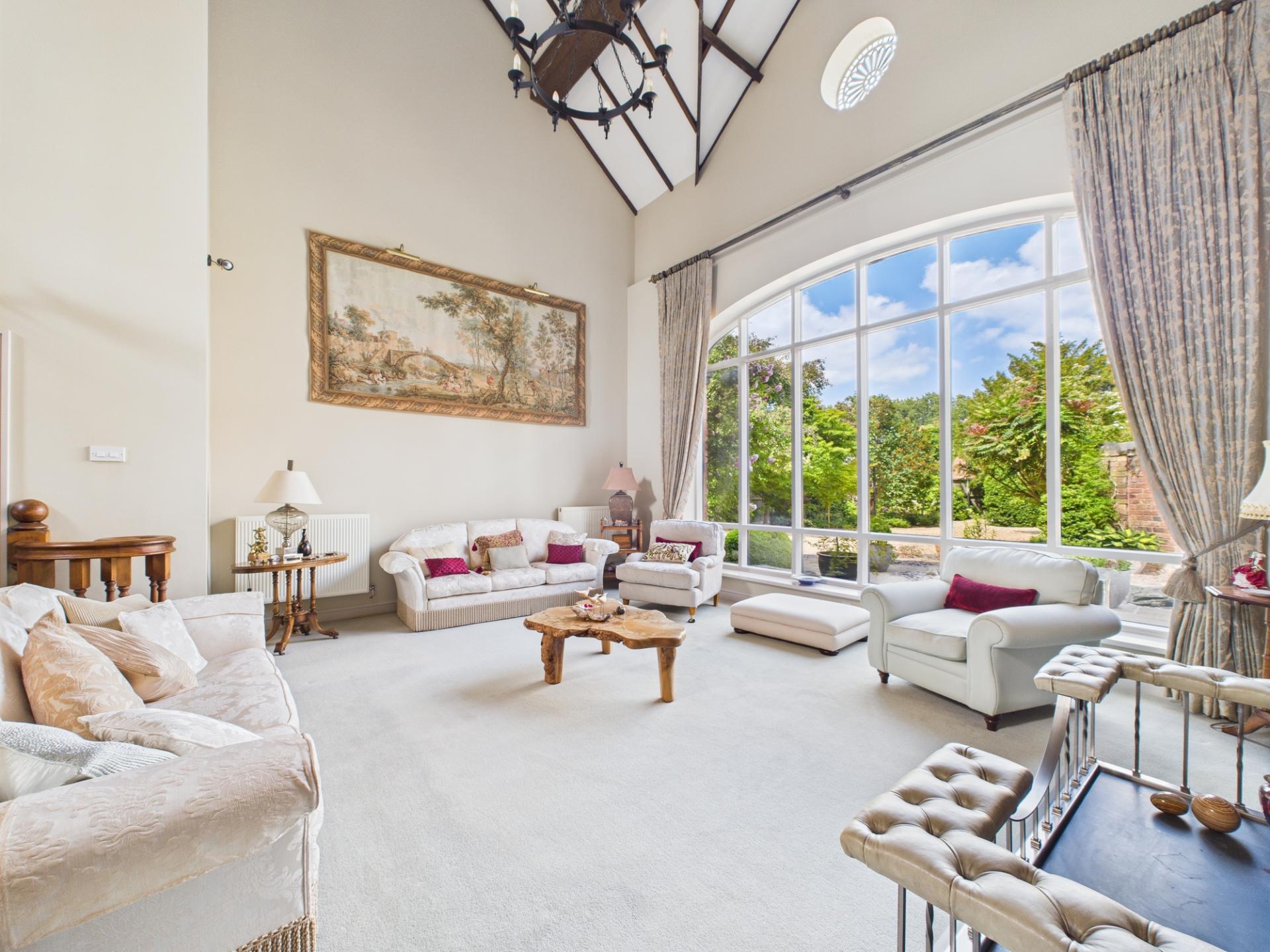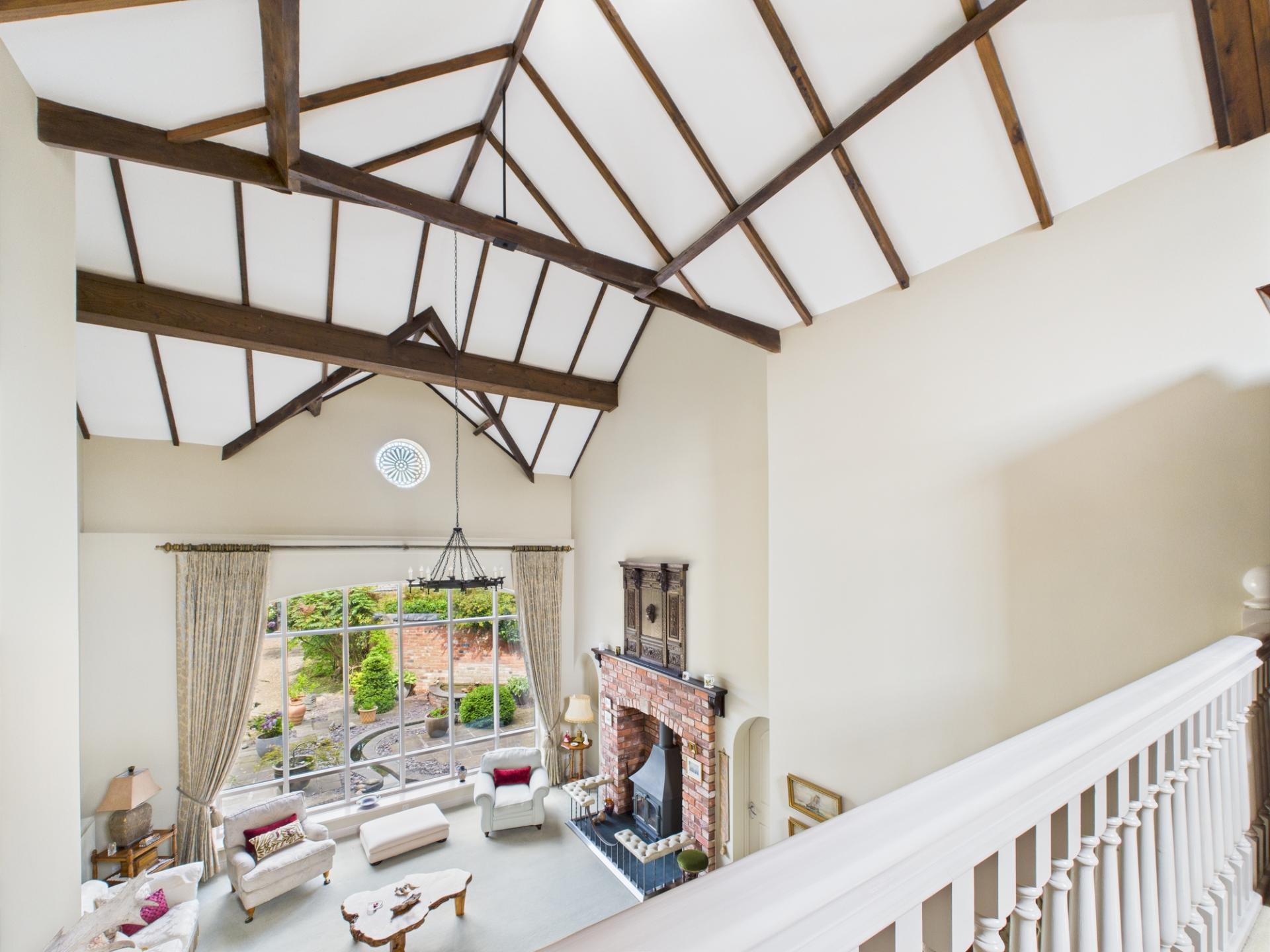 L-shaped hallway, kitchen/breakfast room, utility room, sitting room, living room/dining room with a vaulted ceiling, cloakroom/WC, galleried landing, five bedrooms; four with en-suite facilities & master bedroom with a dressing room, stunning gardens and grounds, detached outbuilding (currently configured as an office and store rooms), extensive driveway, EPC Rating: Pending.