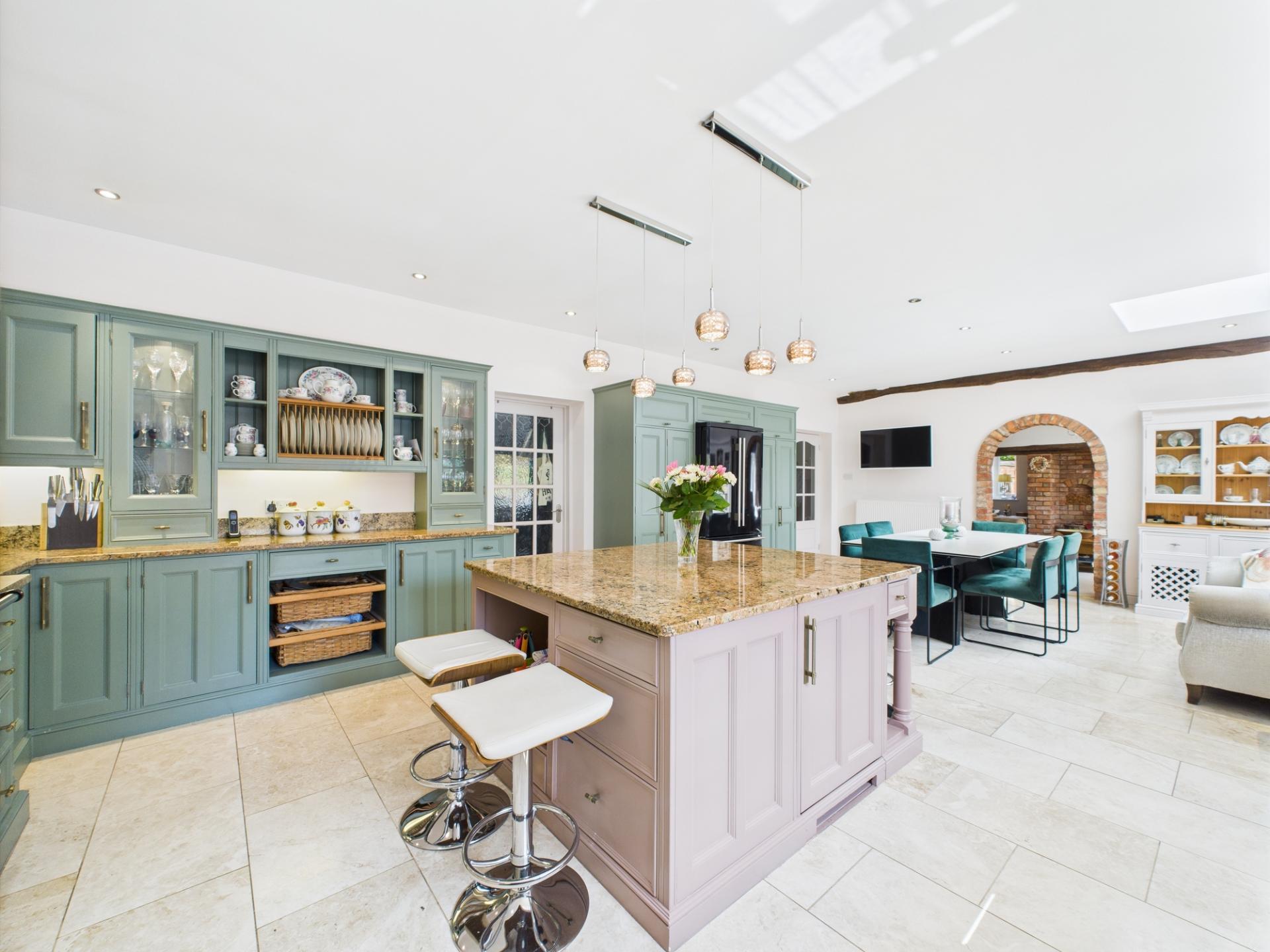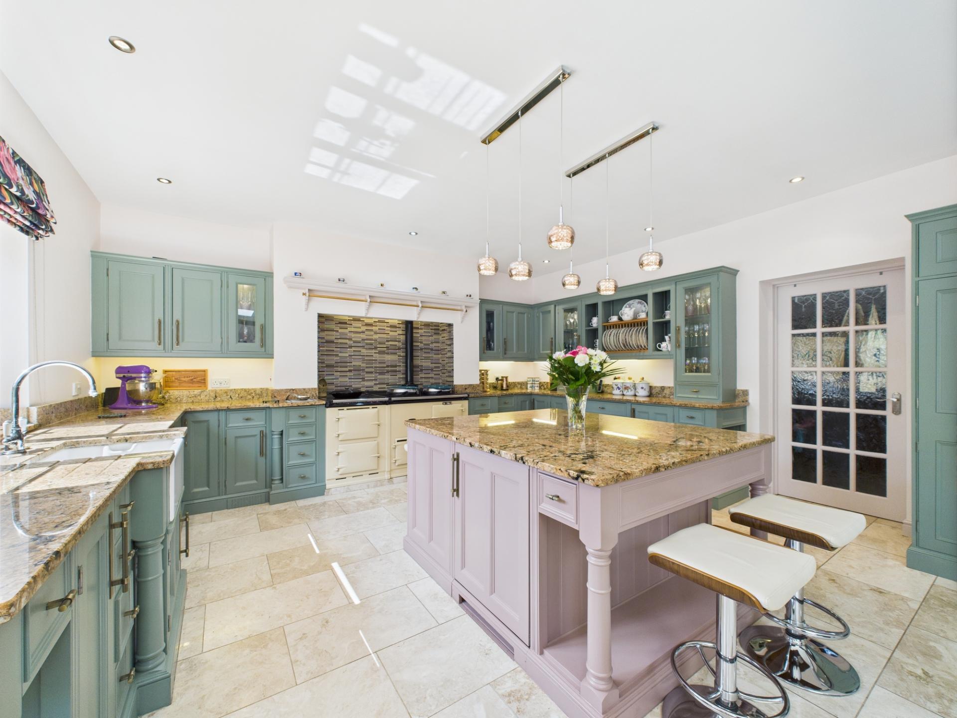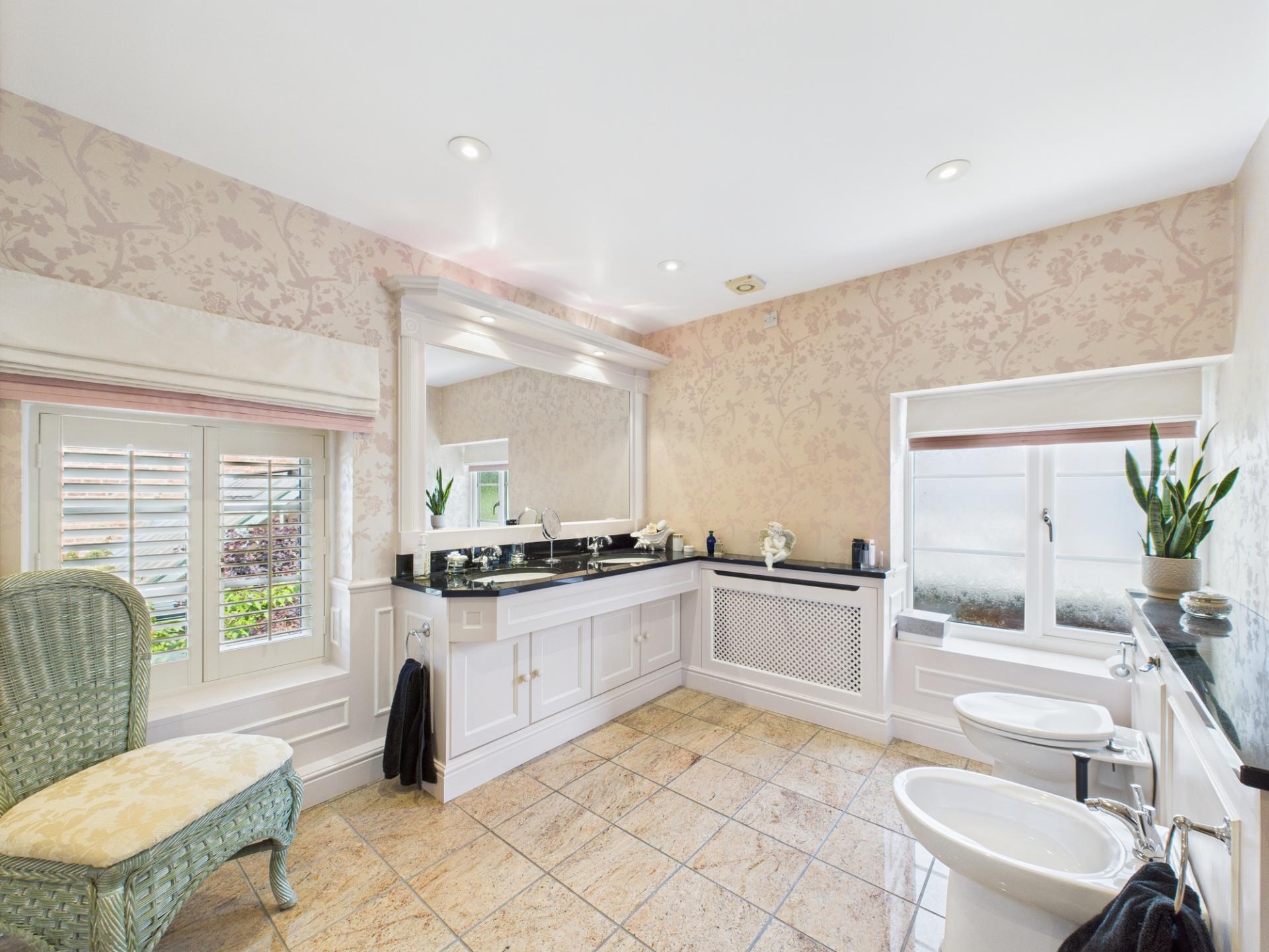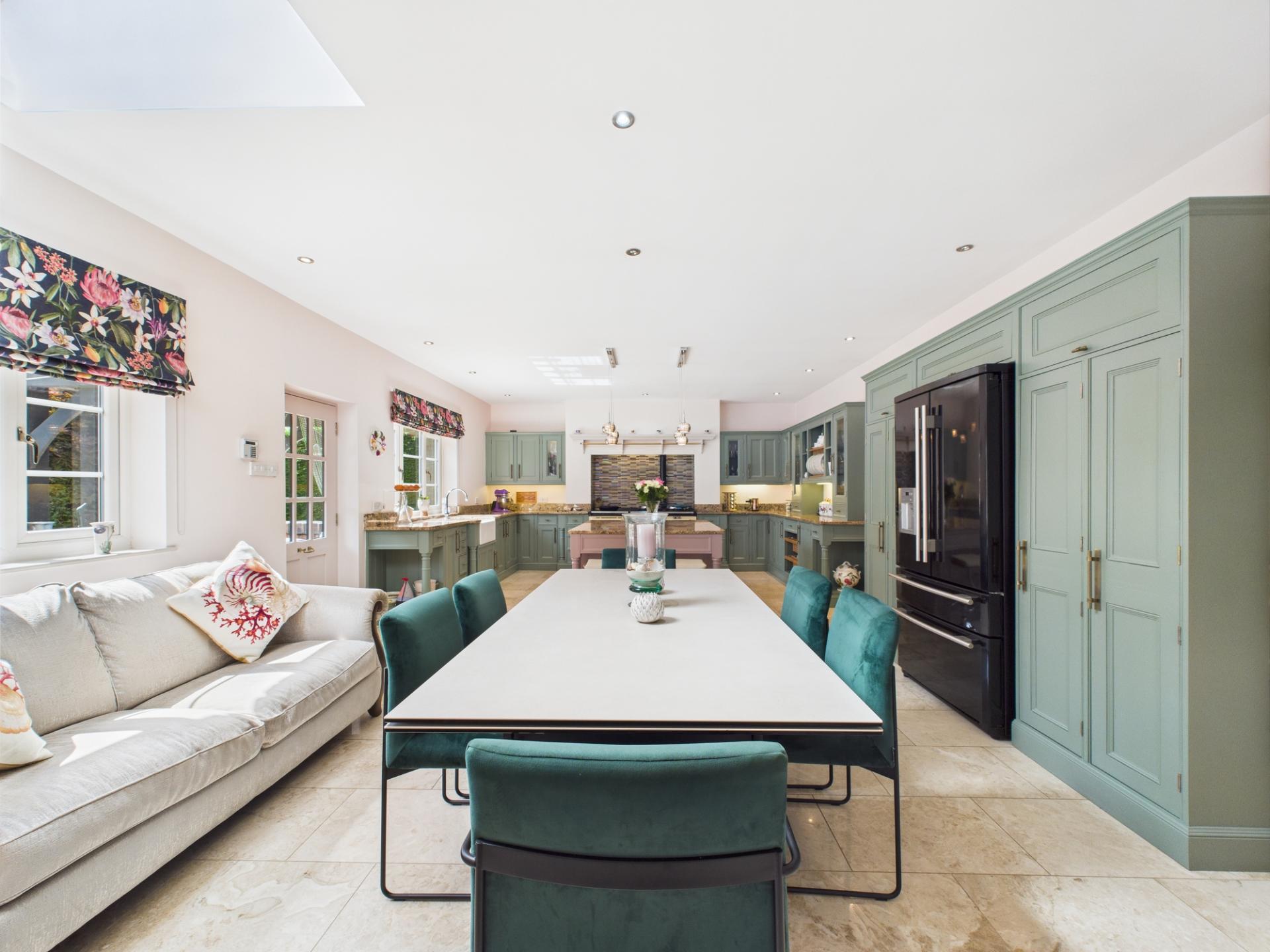 L-shaped hallway, kitchen/breakfast room, utility room, sitting room, living room/dining room with a vaulted ceiling, cloakroom/WC, galleried landing, five bedrooms; four with en-suite facilities & master bedroom with a dressing room, stunning gardens and grounds, detached outbuilding (currently configured as an office and store rooms), extensive driveway, EPC Rating: Pending.