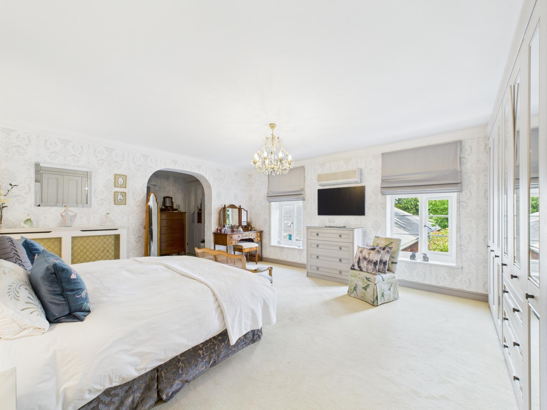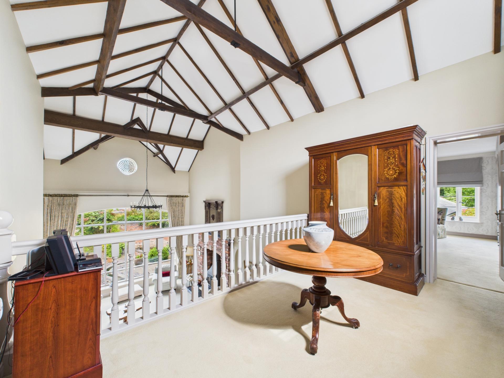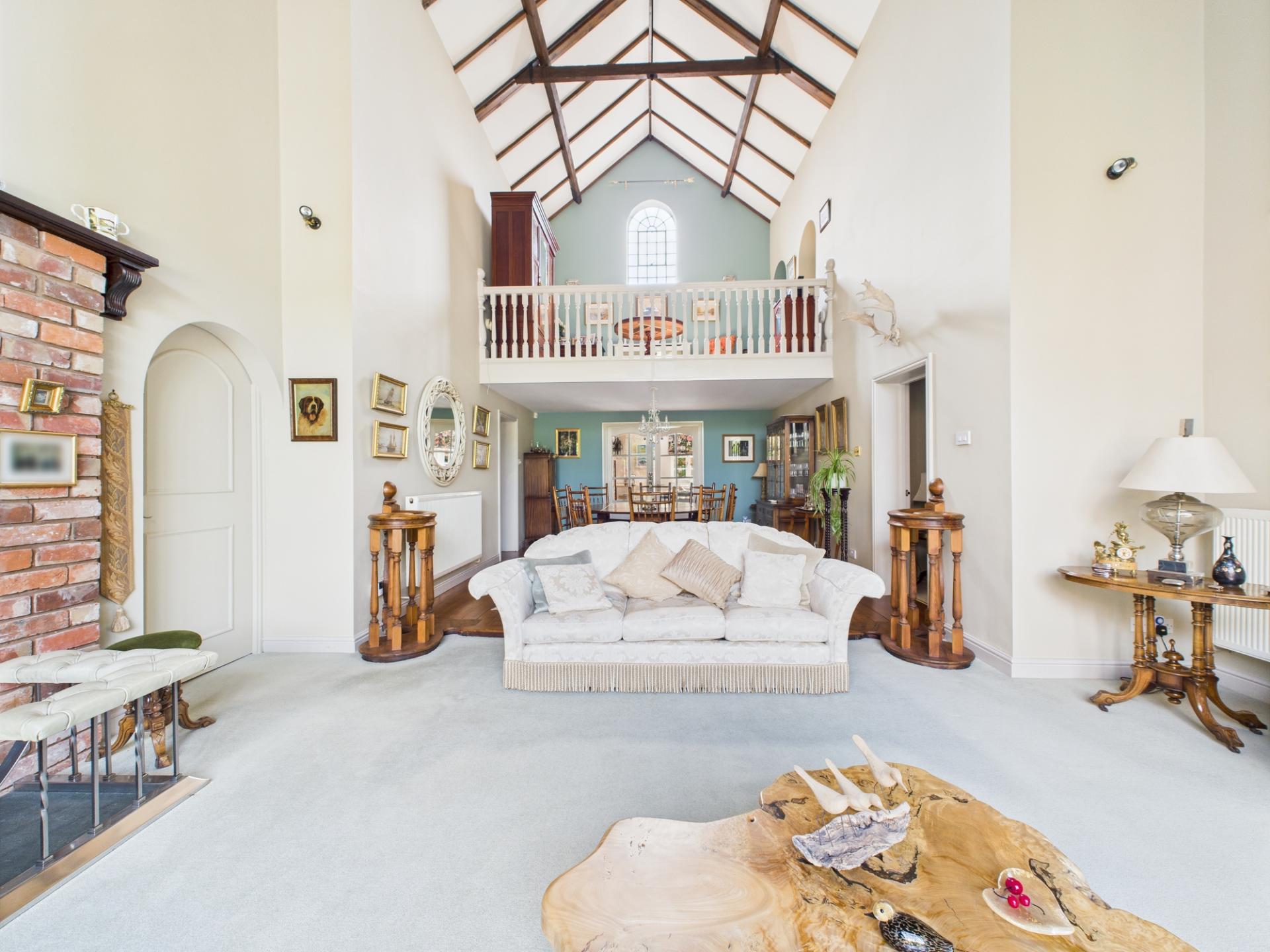 A particular feature to the first floor is the landing which looks out towards the vaulted ceiling and living area and gives access off to a further three bedrooms; all of which have en-suite facilities. The master bedroom also having a dressing room area with a spiral staircase leading up to the attic space, which is currently used as an extended dressing area & storage facility. Extensive fitted wardrobes are in the two main first floor bedrooms together with a fitted cupboard on the landing.
