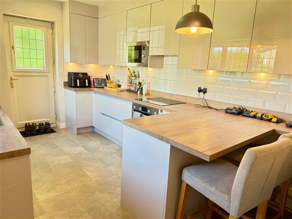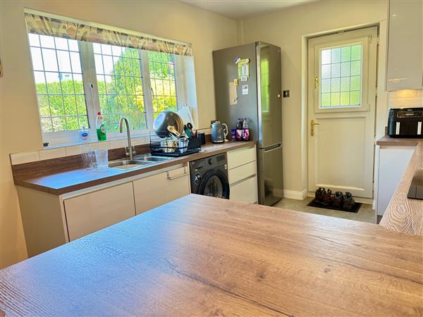 Wide range of wall and base units in a high gloss white finish with complimentary worktops and splashback tiling. Single oven with four ring ceramic hob and inset extractor hood. One and a half bowl stainless steel sink unit with a monotap and plumber for automatic washer. Eye level built in microwave, space for free standing fridge freezer, breakfast area and radiator.