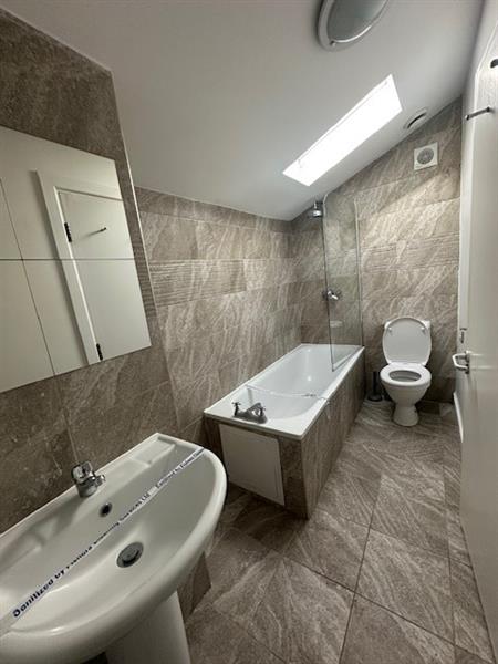Three piece suite in white comprising panelled bath unit with an overhead shower and glass screen. Close couple wc and hand basin. Radiator, Velux roof window, fully tiled and extractor fan.