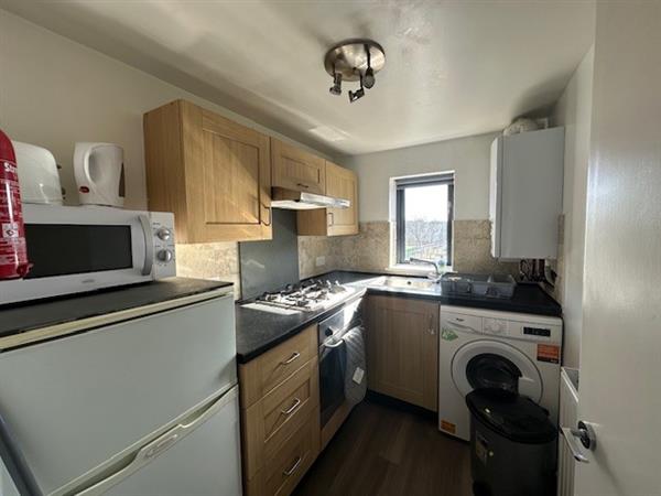 Range of wall and base units in an oak finish with granite effect worktops. One and a half bowl stainless steel sink unit with mono tap, built in oven, four ring gas hob and stainless steel extractor fan. Free standing fridge freezer and washing machine. Splash back tiling, side facing uvpc double glazed window and radiator.