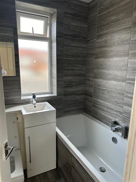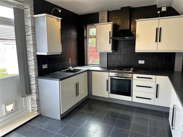 Wide range of wall and base units with complimentary worktops and splashback tiling. Single oven, four-ring gas hob and extractor fan. One and a half bowl sink unit with a stainless steel monotap. Integrated fridge and freezer, patio doors to rear garden and radiator.
