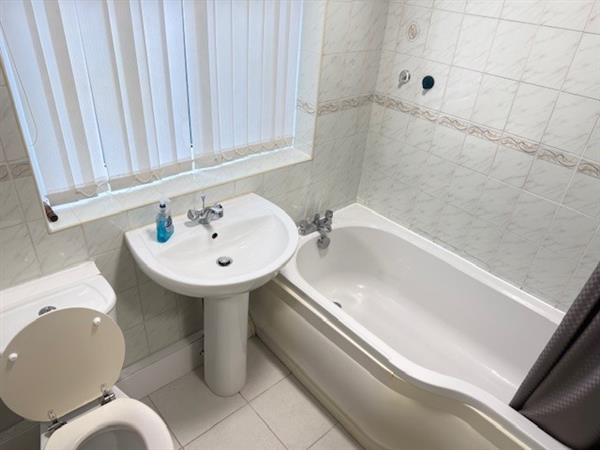 Modern three-piece suite in white comprising; panelled bath with electric shower over, wc and basin. Fully tiled and uvpc curtesy glazed window having vertical blinds. radiator